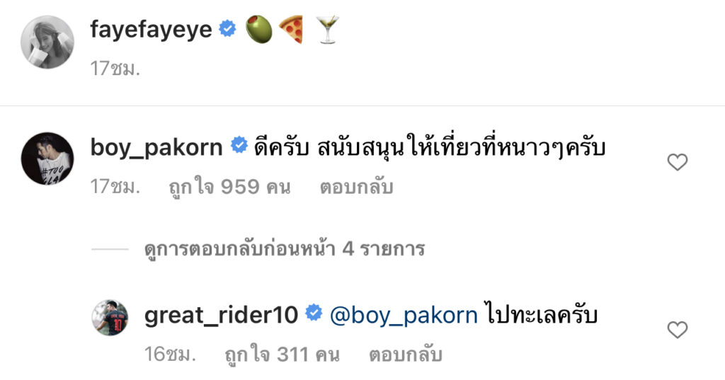ล่าสุดทางด้านสาวเฟย์ออกมาเคลื่อนไหวแล้ว โดยการลงรูปภาพนั่งรอทานข้าว น่ารักใสๆ ขณะที่หนุ่มบอยก็ไม่พลาดเข้ามาคอมเมนต์แซวว่า“ดีครับ สนับสนุนให้เที่ยวที่หนาวๆครับ“ซึ่งเวลาต่อมาเพื่อนสนิทอย่างหนุ่ม“เกรท วรินทร“รีบเข้ามาแซวตอบกลับว่า“ไปทะเลครับ” แหมๆเรียกว่าเข้ามาแซวกันเก่งมาก งานนี้ก็ทำเอาแฟนคลับลุ้นว่าเมื่อไหร่จะมีรูปคู่ออกมาอวดชาวเน็ตกันสักที