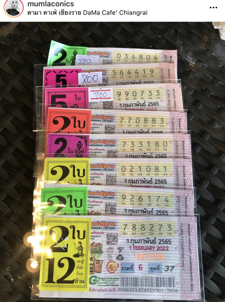 ต่อด้วย “มัม ลาโคนิค“เป็นอีกคนในวงการบันเทิงที่สร้างความฮือฮาให้คอหวยหนักมาก เพราะงวดที่แล้วเธอฟาดรางวัลไปไม่เบา งวดนี้มาจัดต่อโดยเจ้าตัวได้ฟาดเลขเด็ดโพสต์ภาพล็อตเตอรี่ที่เจ้าตัวซื้อลงในไอจีส่วนตัวเพื่อให้คอหวยทั้งหลายต่างส่อง ซึ่งประกอบไปด้วย 034804, 564419, 990733, 770883, 733180, 021081, 926174 และ 788273 พร้อมแคปชั่น“ซื้อแค่นี้แหละ โปรดใช้วิจารณญาณในการรับชม“# ล็อตเตอรี่เชียงราย #ดวงใครดวงมัน