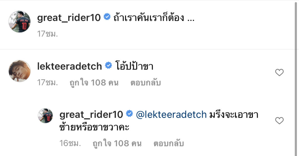 แหมๆงานนี้รุ่นน้องคนสนิทอย่าง“อาเล็ก ธีรเดช“ก็ไม่พลาดเข้ามาคอมเมนต์แซวว่า“โอ้ปป้าขา” ซึ่งหนุ่มเกรทรีบเข้ามาตอบกลับว่า“จะเอาขาซ้ายหรือขาขวาคะ“เรียกว่างานนี้มีสวนกลับได้ดุเดือดจริงๆ ไม่เสียชื่อเจ้าพ่อสายกวน สายเกรียนเลยจ้า