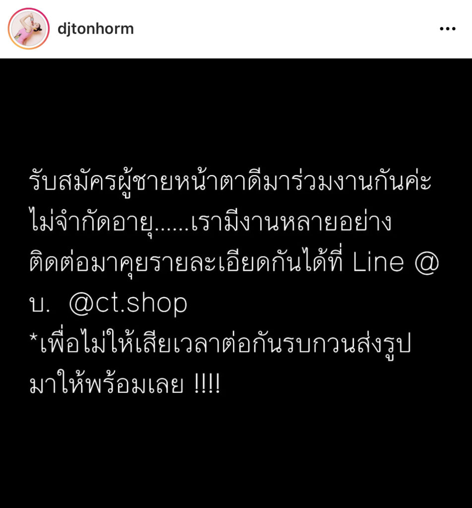 “รับสมัครผู้ชายหน้าตาดี มาร่วมงานกันค่ะไม่จำกัดอายุ…เรามีงานหลายอย่างติดต่อมาคุยรายละเอียดกันได้*เพื่อไม่ให้เสียเวลาต่อกันรบกวนส่งมาให้พร้อมเลย !!!! มาพร้อมแคปชั่นเด็ด“รูป อายุ ส่วนสูง น้ำหนัก รายได้ขั้นต่ำต่อเดือนที่ต้องการ” แหมๆ ใครรู้ตัวว่าเป็นผู้ชายแถมหน้าตาดีต้องรีบไปสมัครเลยนะคะ ช้าอดเต็มก่อนไม่รู้ด้วยนะ ซึ่งงานนี้ก็มีเหล่าบรรดาชาวเน็ตเข้ามาคอมเมนต์สมัครกันสนั่นไอจี