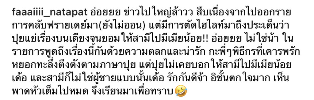 ล่าสุดเจ้าตัวได้ออกมาชี้แจงถึงเรื่องนี้โดยโพสต์ภาพคู่พร้อมแคปชั่นว่า“อ่อยยย ข่าวไปใหญ่แล้ว สืบเนื่องจากไปออกรายการคลับฟรายเดย์มา (ยังไม่ออน) แต่มีการตัดไฮไลท์มาถึงประเด็นว่า ปุยแย่เรื่องบนเตียงจนยอมให้สามีไปมีเมียน้อย!! อ่อยยย ไม่ใช่น้า ในรายการพูดถึงเรื่องนี้กันด้วยความตลกและน่ารัก กะพี่ๆ พิธีกรที่เคารพรัก หยอกทะลึ่งตึงตังตามภาษาปุย แต่ปุยไม่เคยบอกให้สามีไปมีเมียน้อยเด้อ และสามีก็ไม่ใช่ผู้ชายแบบนั้นเด้อ รักกันดีจ้า ชั้นตกใจมาก เห็นพาดหัวเต็มไปหมด จึงเรียนมาเพื่อทราบ”