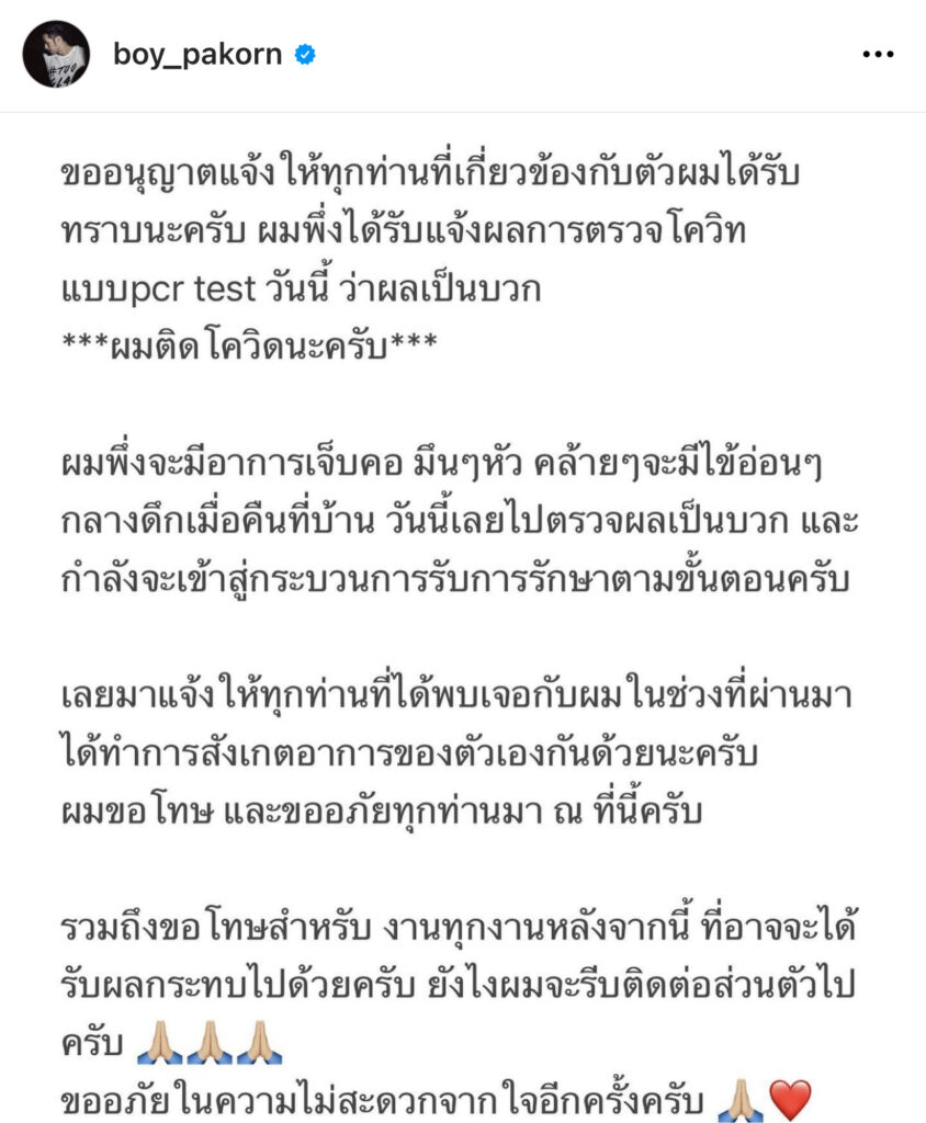 ก่อนหน้านี้ทำเอาแฟนคลับอดเป็นห่วงไม่ไหว เมื่อพระเอกสุดหล่อ“บอย ปกรณ์“ได้ออกมาประกาศว่าเจ้าตัวได้รับเชื้อโควิด-19 มีอาการเจ็บคอ มึนหัว มีไข้อ่อนๆ และต้องขอโทษผู้ที่ได้รับผลกระทบด้วย