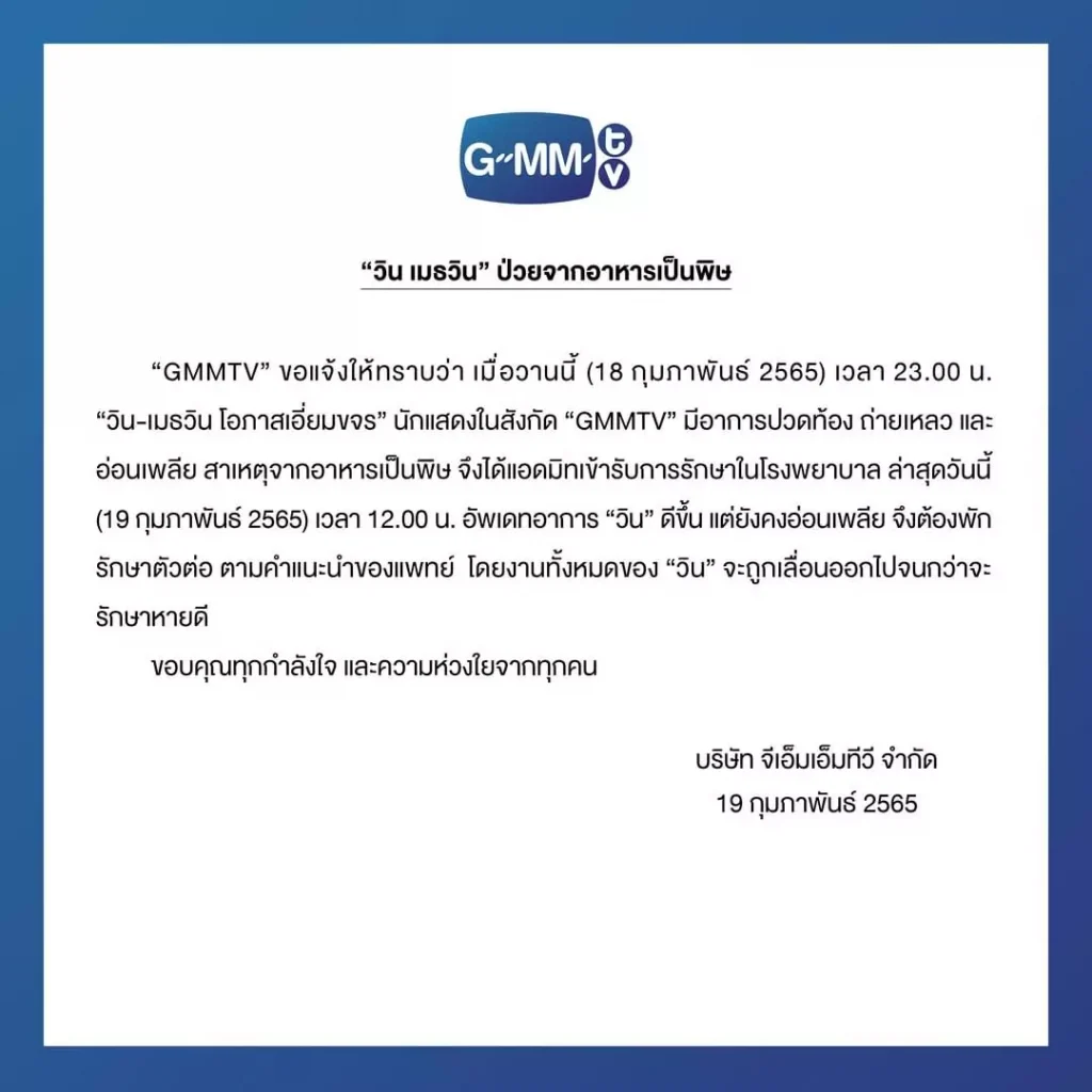 โดยได้โพสต์ภาพที่เขียนข้อความว่า “GMMTV”ขอแจ้งทราบว่า เมื่อวานวันที่(18 กุมภาพันธ์ 2566) เวลา23.00น.”วิน เมธวิน โอภาสเอี่ยมขจร“นักแสดงในสังกัด GMMTV มีอาการปวดท้อง ถ่ายเหลว และอ่อนเพลีย สาเหตุจากอาหารเป็นพิษ จึงได้แอดมิทเข้ารับการรักษาในโรงพยาบาล ล่าสุดวันนี้ (19 กุมภาพันธ์ 2565) เวลา 12.00 น. อัพเดทอาการ “วิน” ดีขึ้น แต่ยังคงอ่อนเพลีย จึงต้องพักรักษาตัวต่อ ตามคำแนะนำของแพทย์ โดยงานทั้งหมดของ “วิน” จะถูกเลื่อนออกไปจนกว่าจะรักษาหายดี ขอบคุณทุกกำลังใจ และความห่วงใยจากทุกคน