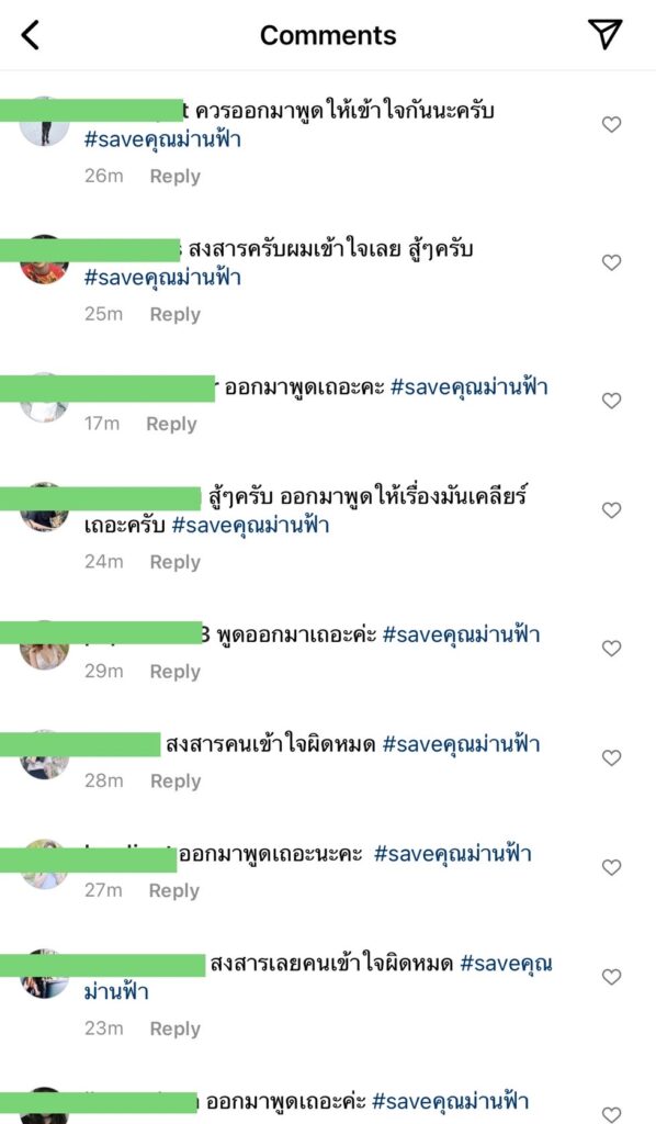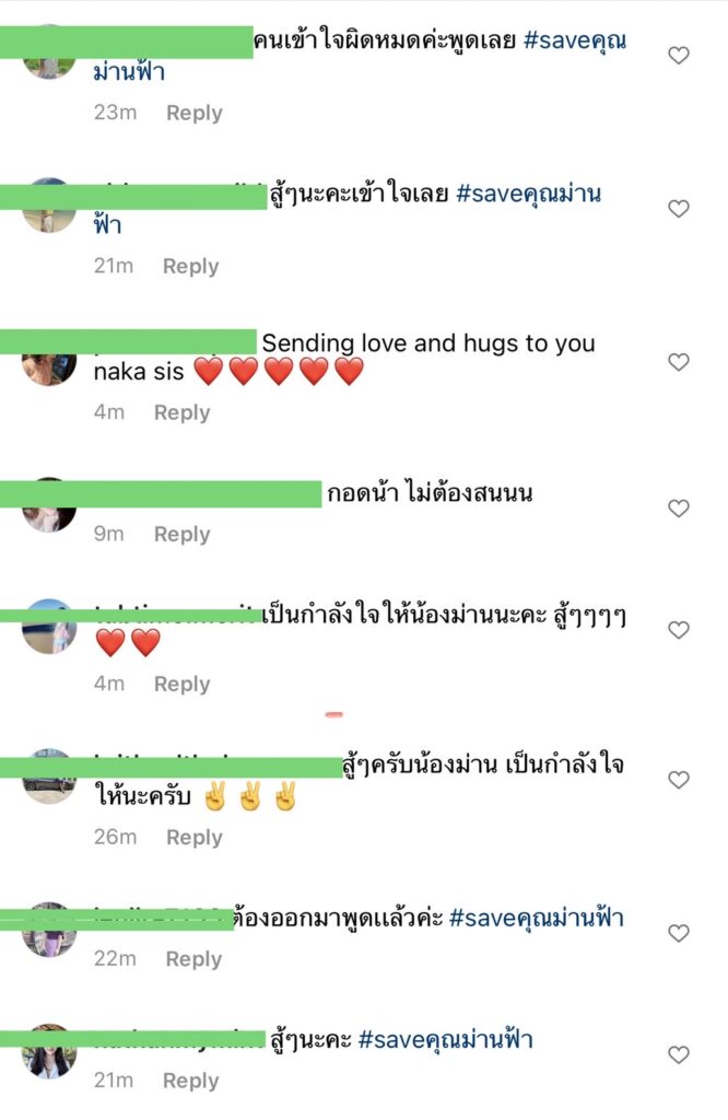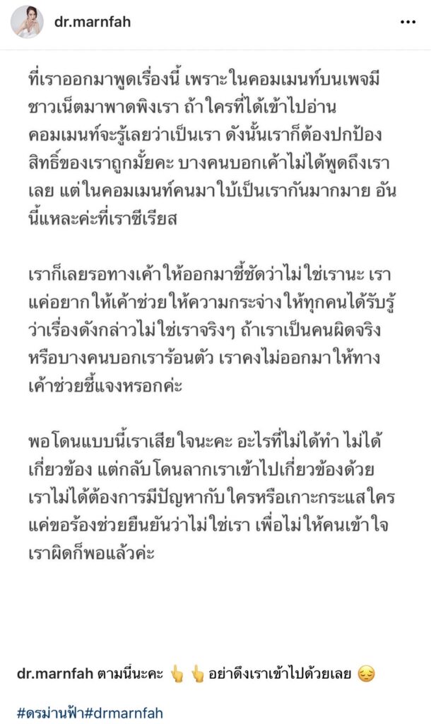 “ที่เราออกมาพูดเรื่องนี้ เพราะในคอมเมนท์บนเพจมีชาวเน็ตมาพาดพิงเรา ถ้าใครที่ได้เข้าไปอ่านคอมเมนท์จะรู้เลยว่าเป็นเรา ดังนั้นเราก็ต้องปกป้องสิทธิ์ของเราถูกมั้ยคะ บางคนบอกเค้าไม่ได้พูดถึงเราเลย แต่ในคอมเมนท์คนมาใบ้เป็นเรากันมากมาย อันนี้แหละค่ะที่เราซีเรียส