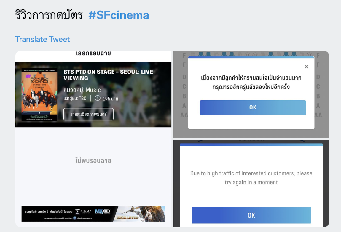 โดยโรงภาพยนตร์ SF เปิดให้จองตั๋วในเช้าวันนี้พา #SFcinema ขึ้นแทรนด์อันดับหนึ่งด้วยมวลมหาพลัง ARMY ที่รอจองตั๋วตั้งแต่ 8 โมงเช้า แต่ก็ต้องตกใจ(ปนแอบเสียใจนิดๆ)ที่บัตรขายออกรัวๆ ในไม่กี่ชั่วโมง พาแอปฯจองตั๋วล่มอย่างง่ายดาย ตอกย้ำรัศมีความดังของหนุ่มๆได้ดีทีเดียว