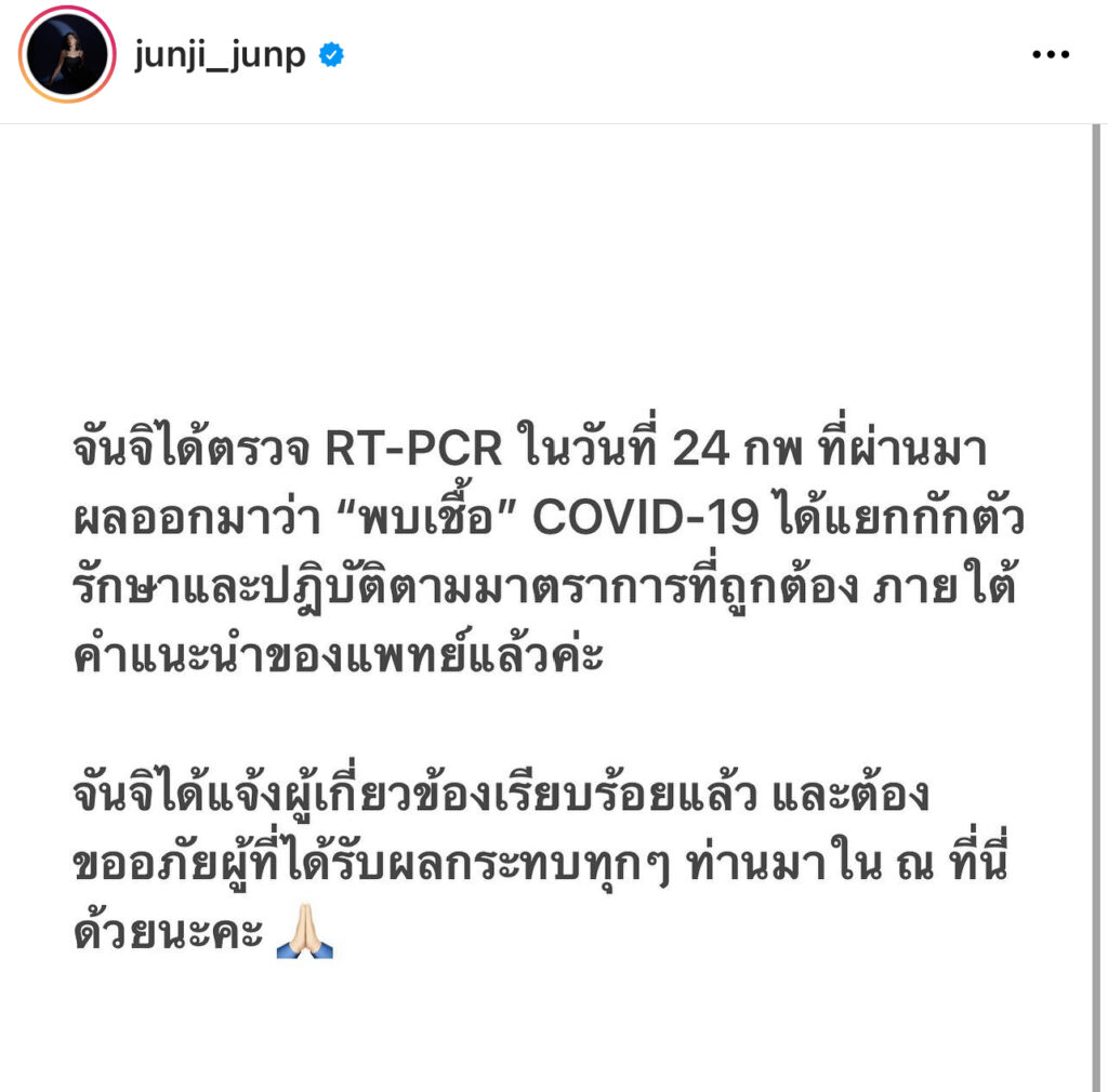 มาอีกราย!”จันจิ จันจิรา” ประกาศติดเชื้อโควิด เผยมีอาการเจ็บคอและน้ำมูก ลั่นขอโทษผู้ที่ได้รับผลกระทบ