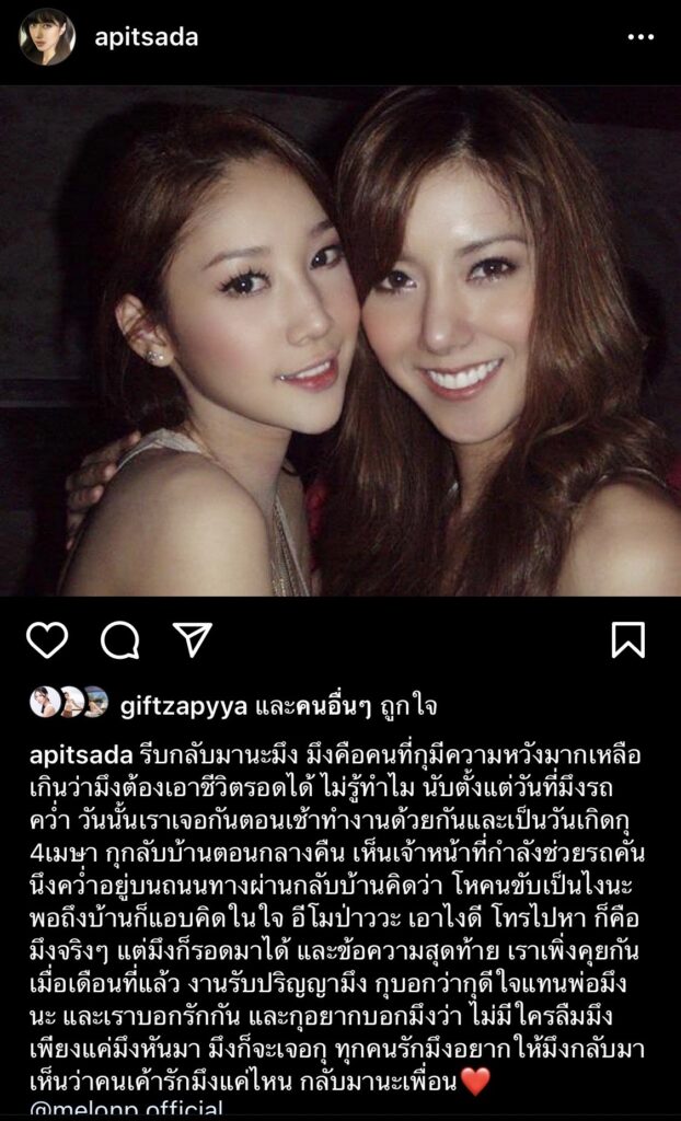 โดยได้โพสต์ภาพคู่พร้อมแคปชั่นว่า“รีบกลับมานะมึง มึงคือคนที่กุมีความหวังมากเหลือเกินว่ามึงต้องเอาชีวิตรอดได้ ไม่รู้ทำไม นับตั้งแต่วันที่มึงรถคว่ำ วันนั้นเราเจอกันตอนเช้าทำงานด้วยกันและเป็นวันเกิดกุ 4เมษา กุกลับบ้านตอนกลางคืน เห็นเจ้าหน้าที่กำลังช่วยรถคันนึงคว่ำอยู่บนถนนทางผ่านกลับบ้านคิดว่า โหคนขับเป็นไงนะ พอถึงบ้านก็แอบคิดในใจ อีโมป่าววะ เอาไงดี โทรไปหา ก็คือมึงจริงๆ แต่มึงก็รอดมาได้ และข้อความสุดท้าย เราเพิ่งคุยกันเมื่อเดือนที่แล้ว งานรับปริญญามึง กุบอกว่ากุดีใจแทนพ่อมึงนะ และเราบอกรักกัน และกุอยากบอกมึงว่า ไม่มีใครลืมมึงเพียงแค่มึงหันมา มึงก็จะเจอกุ ทุกคนรักมึงอยากให้มึงกลับมาเห็นว่าคนเค้ารักมึงแค่ไหน กลับมานะเพื่อน❤️@melonp.official ซึ่งงานนี้ก็มีชาวเน็ตเข้ามาส่งกำลังใจกันอย่างล้นหลาม