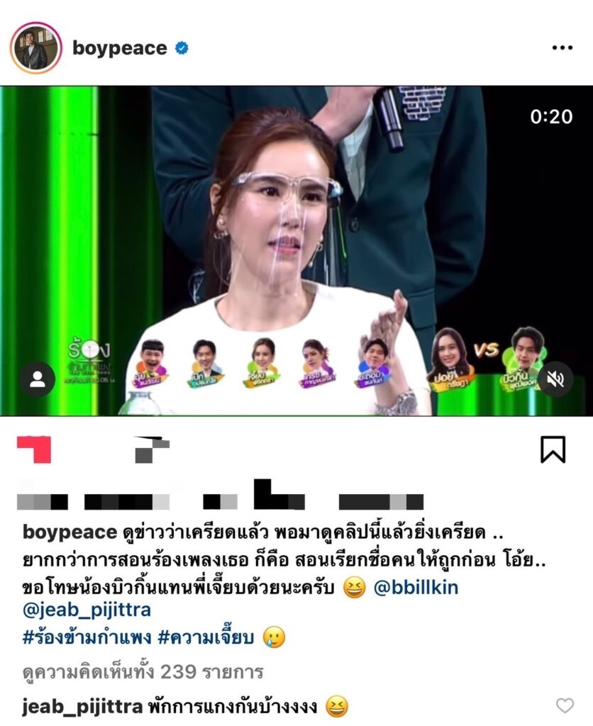 @boypeace ดูข่าวว่าเครียดแล้ว พอมาดูคลิปนี้แล้วยิ่งเครียด .. ยากกว่าการสอนร้องเพลงเธอ ก็คือ สอนเรียกชื่อคนให้ถูกก่อน โอ้ย.. ขอโทษน้องบิวกิ้นแทนพี่เจี๊ยบด้วยนะครับ @bbillkin @jeab_pijittra #ร้องข้ามกำแพง #ความเจี๊ยบซึ่งงานนี้ พอสาวเจี๊ยบ ได้เห็นคลิปถึงกับรีบเข้ามาคอมเมนต์ร้องขอสามีเลยว่า พักการแกงกันบ้าง !!!