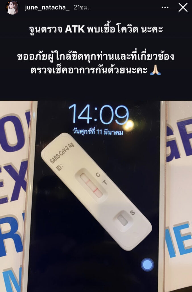 โดยเจ้าตัวได้โพสต์ภาพโชว์ผลตรวจ2ขีด พร้อมเขียนว่า“จูนตรวจATK พบเชื้อโควิดนะคะ ขออภัยผู้ที่ใกล้ชิดทุกท่านและที่เกี่ยวข้องด้วยเชคอาการกันด้วยนะคะ ซึ่งงานนี้ก็มีเหล่าบรรดาแฟนคลับแห่เข้ามาส่งกำลังใจให้สาวจูนหายป่วยไวๆเป็นจำนวนมาก