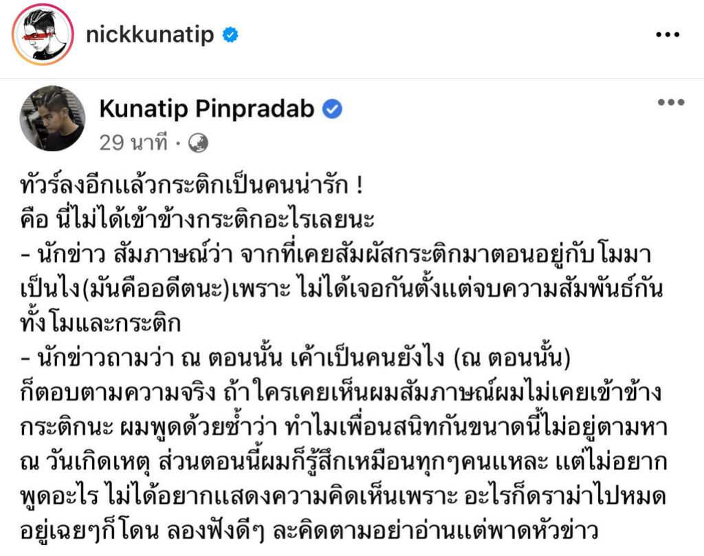 ทัวร์ลง!”นิก คุณาธิป“ร่อนข้อความชี้แจงดราม่าสัมภาษณ์สื่อชม“กระติก“น่ารัก วอนอย่าอ่านแค่พาดหัว