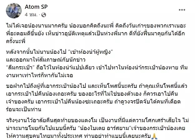โดยได้เขียนแคปชั่นว่า “ไม่ได้เจอน้องนานมากครับ น้องบอกคิดถึงนะพี่ คิดถึงวันเก่าๆของพวกเราเนอะ พี่อะตอมดีขึ้นยัง เห็นข่าวอุบัติเหตุแล้วเป็นห่วงพี่มาก ดีที่ยังฟื้นมาคุยกันได้อีกครั้งนะพี่ หลังจากนั้นไม่นานน้อง ไปเข้าห้องน้ำผู้หญิง และออกมาให้สัมภาษณ์กับนักข่าว ลืมกระเป๋าถือไว้ในห้องน้ำแป๊บเดียว เข้าไปหาในห้องน้ำ กระเป๋าน้องหาย ทีมงานหาเท่าไหร่ก็หากันไม่เจอขอฝากไปถึงผู้ที่เอากระเป๋าน้องไป และเห็นโพสต์นี้นะครับ ถ้าคุณเห็นโพสต์นี้แล้วเอากระเป๋าไปคืนน้องเถอะครับ เอาเงินไปอย่างเดียวก็ได้ แล้วเอากระเป๋าไปคืนน้องซะเถอะครับ ถ้าดูวงจรปิดจับได้คนที่เดือดร้อนจะเป็นท่านจริงๆงานไว้อาลัยคืนสุดท้ายของแตงโม เป็นงานที่มีแต่ความโศกเศร้าเสียใจไม่น่าจะมาขโมยกันไปแบบนี้นะครับ น้องใบเตย อาร์สยามเจ้าของกระเป๋าเคยให้ความสุขคนไทยมาทั้งประเทศแล้ว ท่านอย่าทำแบบนี้เลยครับ“