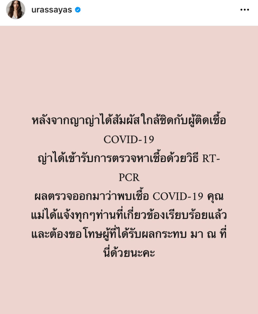 เรียกว่ายังคงแพร่ระบาดต่อเนื่องสำหรับสถานการณ์โควิด-19ที่ยังคงลุกลามคนวงการบันเทิงไม่หวาดไม่หวั่น ซึ่งต่างพากันออกมาแจ้งข่าวการติดเชื้อไม่ขาดสาย ล่าสุดไม่รอดอีกรายสำหรับนางเอกมากฝีมือญาญ่า อุรัสยาที่ได้ออกมาแจ้งข่าวให้ผู้ใกล้ชิดทราบว่าตอนนี้ตนติดเชื้อโควิดโดยได้โพสต์ภาพที่มีข้อความว่า