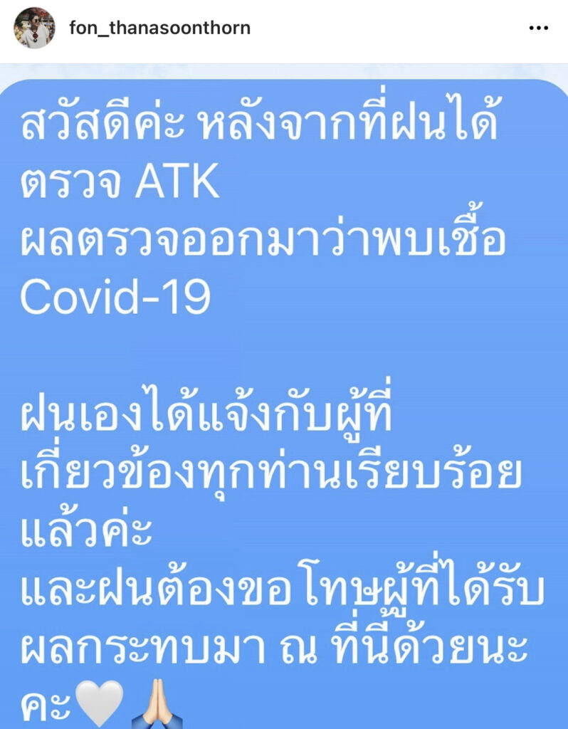 นักร้องสาว“ฝน ธนสุนธร“แจ้งติดโควิด ลั่นขอโทษผู้ได้รับผลกระทบแฟนคลับแห่ส่งกำลังใจ