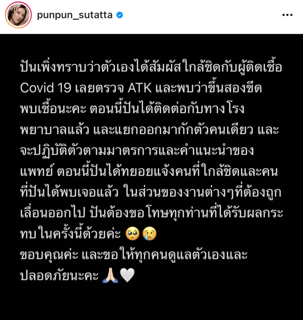 “ปันเพิ่งทราบว่าตัวเองได้สัมผัสใกล้ชิดกับผู้ติดเชื้อ Covid 19 เลยตรวจ ATK และพบว่าขึ้นสองขีด พบเชื้อนะคะ ตอนนี้ปันได้ติดต่อกับทางโรงพยาบาลแล้ว และแยกออกมากักตัวคนเดียว และ จะปฏิบัติตัวตามมาตรการและคำแนะนำของแพทย์ตอนนี้ปันได้ทยอยแจ้งคนที่ใกล้ชิดและคนที่ปันได้พบเจอแล้ว ในส่วนของงานต่างๆ ที่ต้องถูก เลื่อนออกไป ปันต้องขอโทษทุกท่านที่ได้รับผลกระทบในครั้งนี้ด้วยค่ะ ขอบคุณค่ะ และขอให้ทุกคนดูแลตัวเองและปลอดภัยนะคะ”งานนี้ก็มีเพื่อนในวงการบันเทิงรวมไปถึงแฟนคลับต่างเข้ามาส่งกำลังใจให้สาวปันปันหายไวๆกันเป็นจำนวนมาก