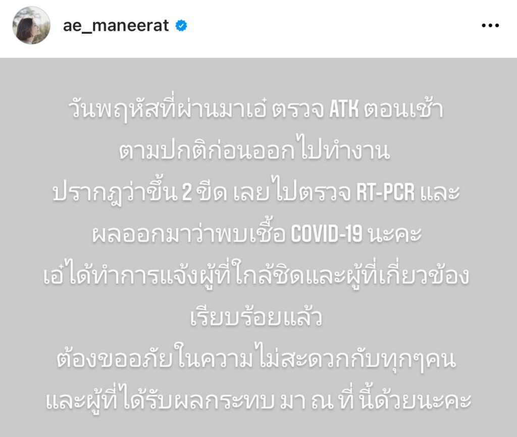 “วันพฤหัสที่ผ่านมาเอ๋ ตรวจ ATK ตอนเช้าตามปกติก่อนออกไปทำงานปรากฏว่าขึ้น2 ขีด เลยไปตรวจ RI-PCR และผลออกมาว่าพบเชื้อ COVD-19 นะคะ ได้ทำการแจ้งผู้ที่ใกล้ชิดและผู้ที่เกี่ยวข้องเรียบร้อยแล้ว ต้องขออภัยในความไม่สะดวกกับทุกๆคนและผู้ที่ได้รับผลกระทบ มา ณ ที่ นี้ด้วยนะคะ” ซึ่งพอสาวเอ๋แจ้งข่าวการติดเชื้อก็มีเพื่อนในวงการบันเทิงรวมไปถึงชาวเน็ตต่างเข้ามาส่งกำลังให้หายป่วยไวๆเป็นจำนวนมาก