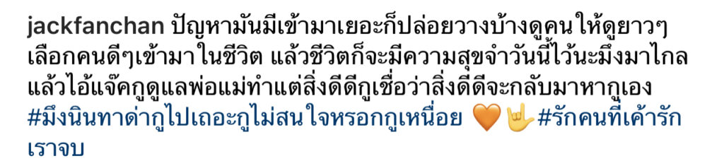 ” ปัญหามันมีเข้ามาเยอะก็ปล่อยวางบ้าง ดูคนให้ดูยาวๆเลือกคนดีๆเข้ามาในชีวิต แล้วชีวิตก็จะมีความสุขจำวันนี้ไว้นะมึงมาไกลแล้วไอ้แจ๊คกูดูแลพ่อแม่ทำแต่สิ่งดีดีกูเชื่อว่าสิ่งดีดีจะกลับมาหากูเอง #มึงนินทาด่ากูไปเถอะกูไม่สนใจหรอกกูเหนื่อย #รักคนที่เค้ารักเราจบ”ซึ่งงานนี้ก็มีเหล่าบรรดาเพื่อนดาราคนสนิท รวมไปถึงแฟนคลับต่างเข้ามาส่งกำลังใจให้หนุ่มแจ๊คเป็นจำนวนมาก ทั้งนี้ยังบอกหนุ่มแจ๊คว่าอย่าไปสนใจคำพูดคนอื่นเลย