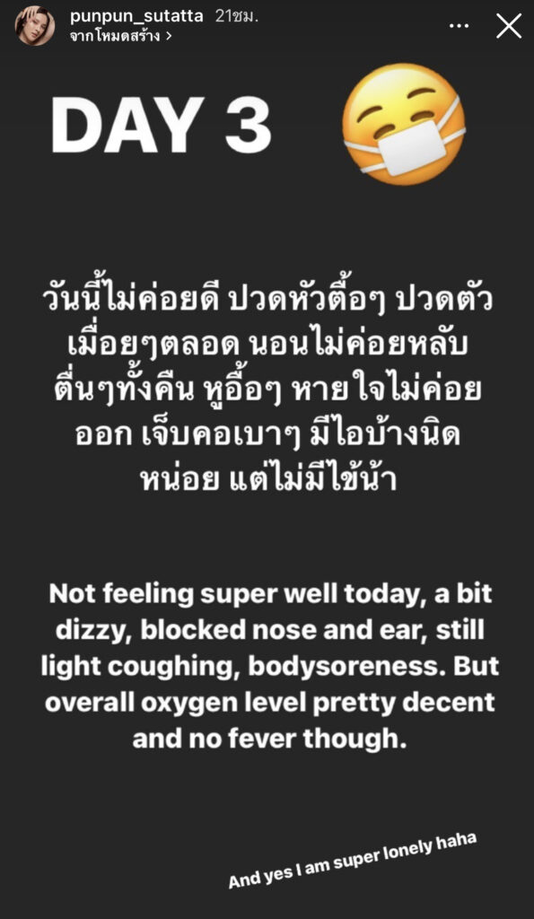 ล่าสุดสาวปันปันได้ออกมาอัพเดทอาการหลังติดโควิดโดยการโพสต์ข้อความที่เขียนข้อความลงในไอจีสตอรี่ว่า “DAY 3 วันนี้ไม่ค่อยดี ปวดหัวตื้อๆ ปวดตัวเมื่อยๆตลอด นอนไม่ค่อยหลับ ตื่นๆทั้งคืน หูอื้อๆ หายใจไม่ค่อยออก เจ็บคอเบาๆ มีไอบ้างนิดหน่อย แต่ไม่มีไข้นะ” ซึ่งงานนี้ก็มีเหล่าบรรดาเพื่อนในวงการบันเทิงรวมถึงแฟนคลับเข้ามาส่งกำลังใจให้สาวปันปันจำนวนมาก