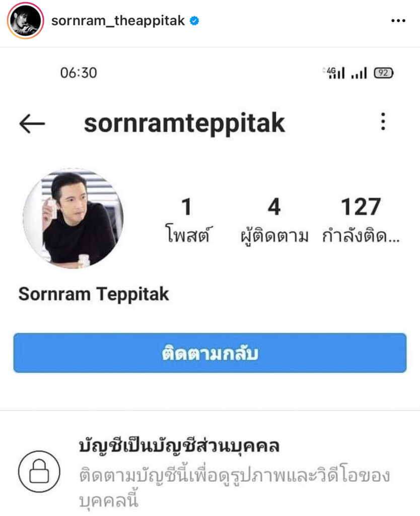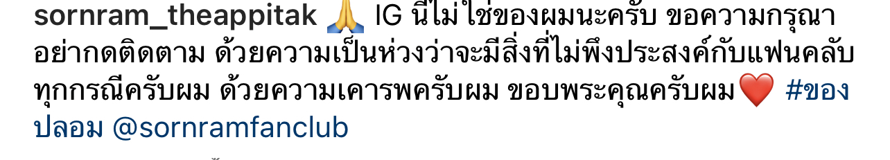 โดยการโพสต์ภาพพร้อมแคปชั่นลงในไอจีว่า “IG นี้ไม่ใช่ของผมนะครับ ขอความกรุณาอย่ากดติดตาม ด้วยความเป็นห่วงว่าจะมีสิ่งที่ไม่พึงประสงค์กับแฟนคลับทุกกรณีครับผม ด้วยความเคารพครับผม ขอบพระคุณครับผม #ของปลอม @sornramfanclub”ซึ่งงานนี้ก็มีแฟนคลับเข้ามาคอมเมนต์แนะนำให้หนุ่ม ศรราม เข้าแจ้งความเอาเรื่องให้ถึงที่สุดไปเลย