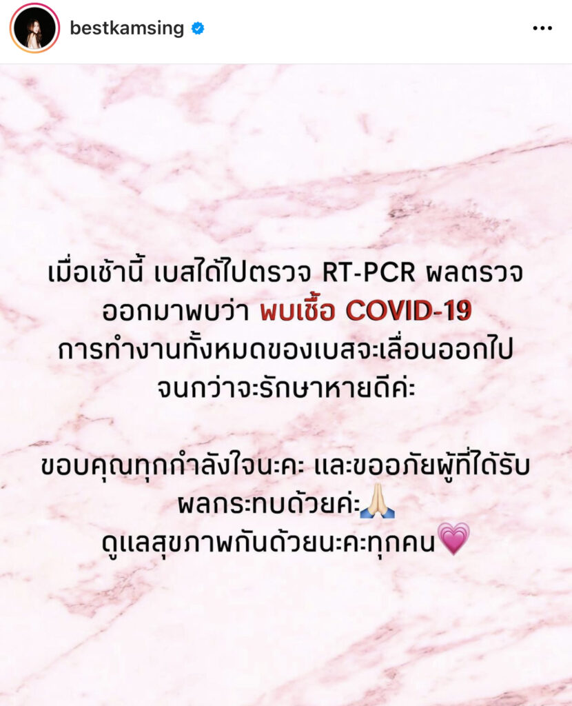 โดยงานนี้สาวเบสก็ได้เขียนข้อความว่า… “เมื่อเช้านี้เบสได้ไปตรวจ PT-PCR ผลตรวจออกมาพบว่า พบเชื้อ COVID-19 การทำงานทั้งหมดของเบสจะเลื่อนออกไปจนกว่าจะรักษาหายดีค่ะ ขอบคุณทุกกำลังใจนะคะ และขออภัยผู้ที่ได้รับผลกระทบด้วยค่ะ ดูแลสุขภาพด้วยนะคะทุกคน” พอแฟนคลับเข้ามาก็เห็นต่าง