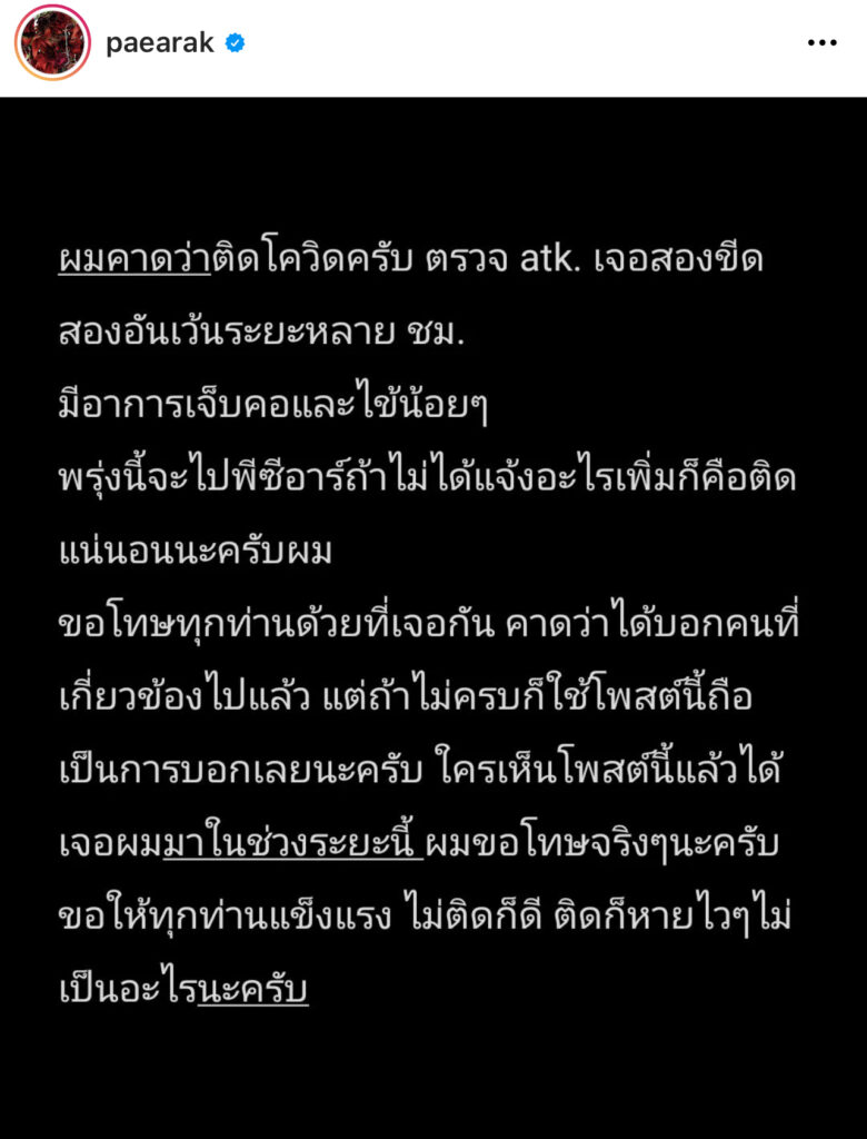 ส่วนอาการโควิดตอนนี้ก็หายแล้ว ทางด้านลองโควิดก็มีนิดหน่อยเรื่องของเสมหะที่รสชาติแปลกๆ วันนั้นไปออกกำลังกาย อาการก็ปกติไม่เหนื่อย ไม่หอบ  ยังร้องเพลงได้ปกติ และจะมีเพลง28เมษายนนี้ รับรองว่ามีเซอร์ไพรส์แน่ รอติดตาม