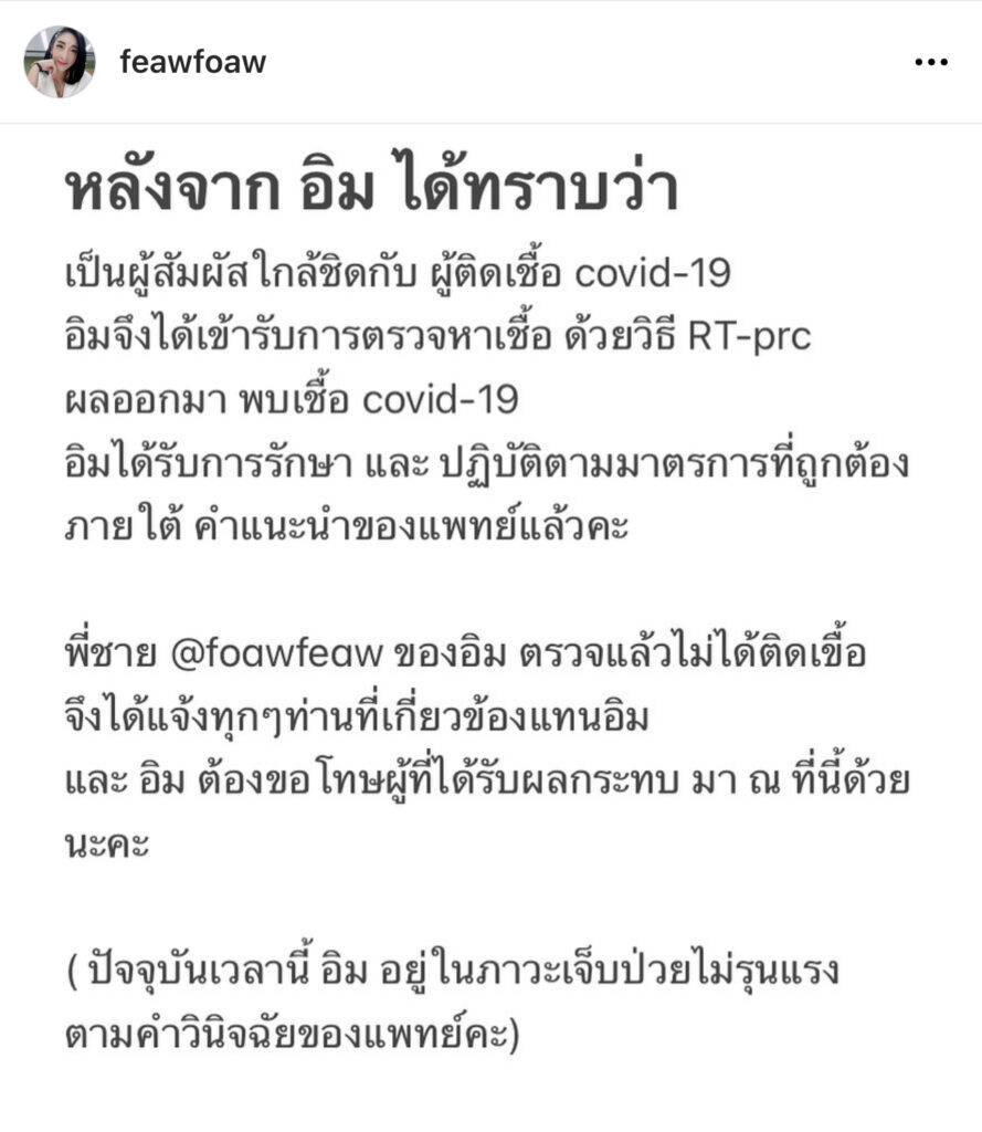พี่ชาย @foawfeaw ของอิม ตรวจแล้วไม่ได้ติดเชื้อ จึงได้แจ้งทุกๆท่านที่เกี่ยวข้องแทนอิมและอิมต้องขอโทษผู้ที่ได้รับผลกระทบ มา ณ ที่นี้ด้วยนะคะ( ปัจจุบันเวลานี้ อิมอยู่ในภาวะเจ็บป่วยไม่รุนแรงตามคำวินิจฉัยของแพทย์คะ)”