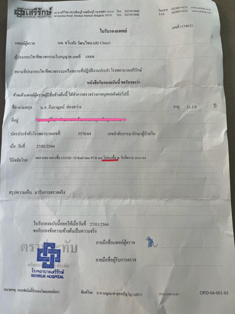 ซึ่งภายหลังจากที่ทราบข่าวว่าอีกฝ่ายติดเชื้อโควิด-19 จากผู้จัดการส่วนตัว ตนและผู้จัดการ จึงได้เดินทางไปตรวจหาเชื้อในวันที่ 27 มกราคมที่ผ่านมา ที่โรงพยาบาลเสรีรักษ์  ซึ่งผลออกมาเป็นลบ คือไม่พบเชื้อ แต่ทั้งนี้ทั้งนั้นเพื่อความปลอดภัยและความสบายใจกับทุกฝ่าย ตนจะขอกักตัวเป็นเวลา 14 วัน และจะเดินทางไปตรวจอีกครั้งเพื่อความแน่ใจ