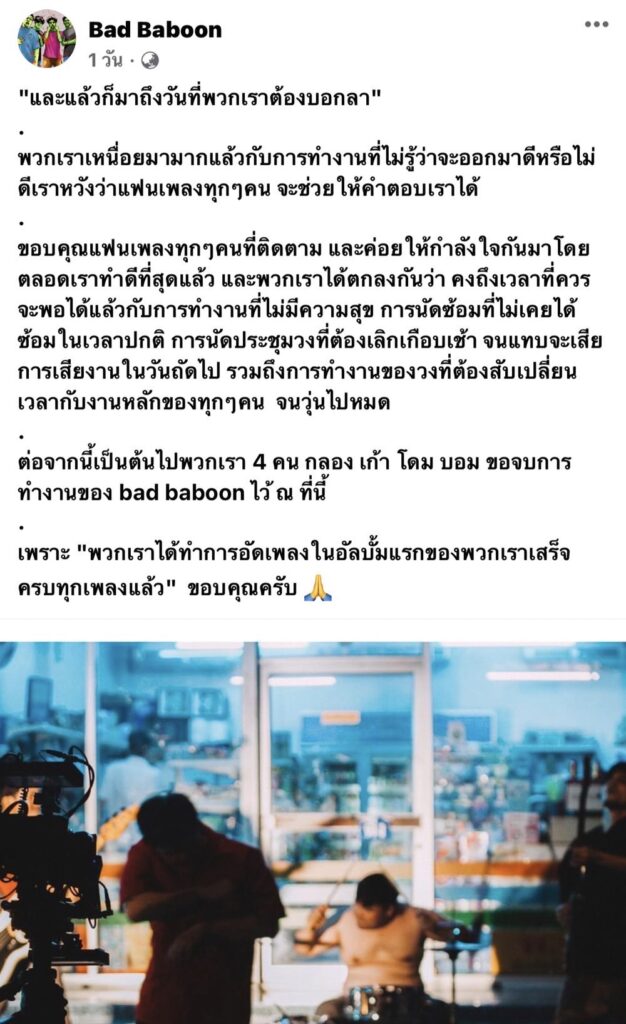 ทำแฟนเพลงใจหาย !! เมื่อวง Bad Baboon ร่ายโพสต์ยาวบอกลาที่ต้องอ่านให้ครบทุกตัวอักษรถึงจะรู้เหตุผล ???