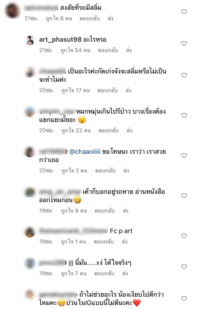 ซึ่งงานนี้ก็มีเหล่าบรรดาชาวเน็ตเข้ามาส่งกำลังใจให้เจอตัวคนร้ายเร็วๆ นอกจากนี้ยังมีชาวเน็ตรายหนึ่งเข้ามาคอมเมนต์แซะแรงว่าสงสัยที่รถมีสลิ่มซึ่งงานนี้หนุ่มอาร์ตก็รีบเข้ามาตอบกลับว่าอะไรหรอนอกจากนี้ยังมีแฟนคลับของหนุ่มอาร์ตเข้ามาต่อว่าชาวเน็ตรายดังกล่าวทำนองว่า ถ้าไม่ช่วยก็อยู่เงียบๆดีกว่า อย่าไปป่วนไอจีใคร มันไม่ดี