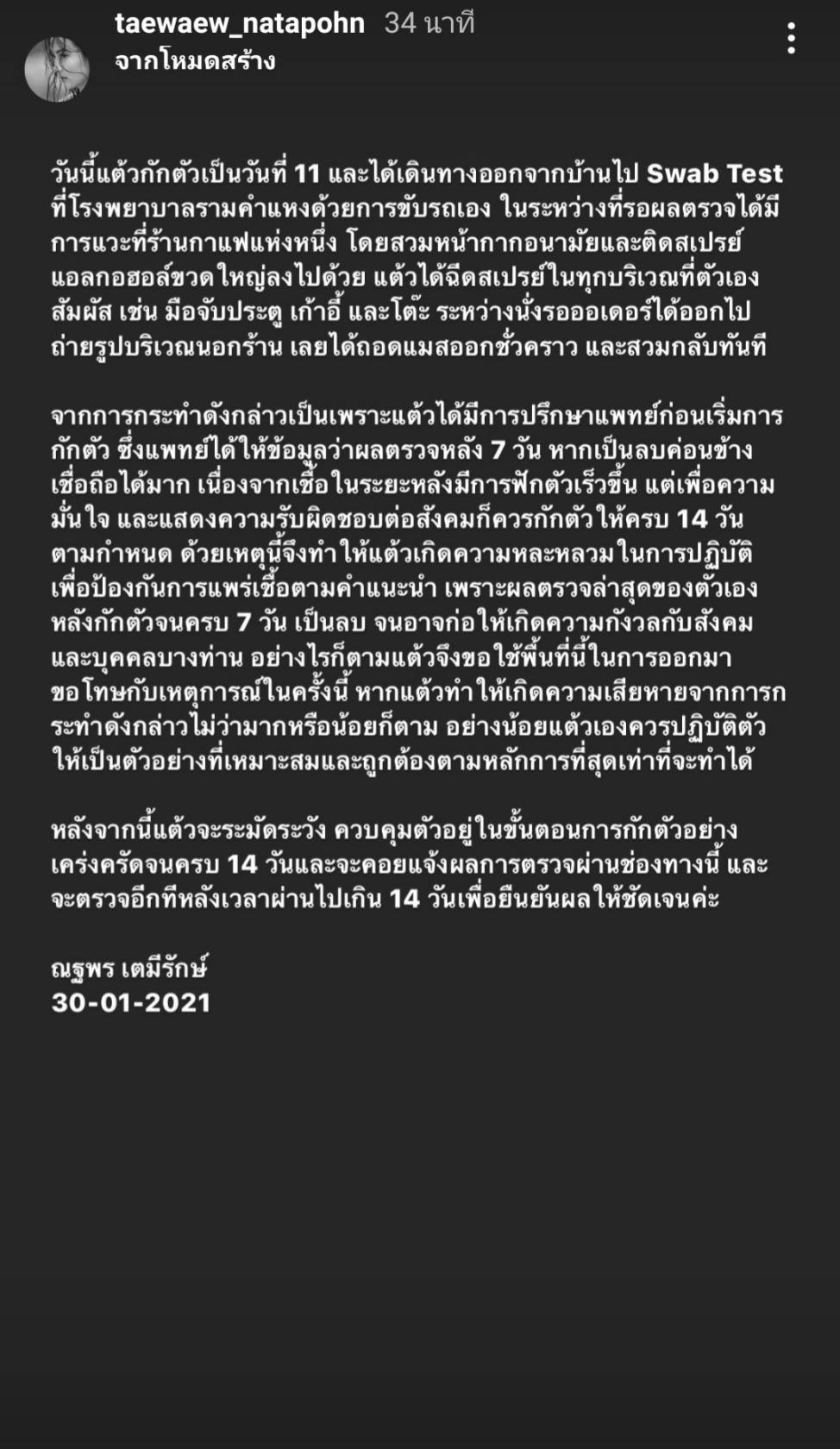 จากกรณีโลกโซเชียลวิพากษ์วิจารณ์ ประเด็นที่ แต้ว-ณฐพร เตมีรักษ์ นักแสดงชื่อดัง ได้เข้าไปใช้บริการร้านกาแฟแห่งหนึ่ง ขณะออกไปตรวจหาเชื้อโควิดรอบที่ 3 หลังกักตัวครบ 11 วัน ก่อนจะถ่ายรูปโดยไม่สวมใส่หน้ากากอนามัย ทำให้เอาชาวเน็ตมองว่าเป็นการกระทำที่ไม่รับผิดชอบต่อสังคมเนื่องจากยังกักตัวไม่ครบ 14 วัน อีกทั้งยังเป็นผู้ที่มีความเสี่ยงสูง แม้ว่าผลตรวจโควิดจะออกมาเป็นลบก็ตาม โดยผู้สื่อข่าวมีรายงานว่า ล่าสุดทางร้านกาแฟ หรือคาเฟ่ ที่นักแสดงสาวไปใช้บริการ ได้ออกมาโพสต์ภาพและข้อความ ประกาศปิดร้าน เพื่อทำความสะอาดบิ๊กคลีนนิ่ง(Big Cleaning) ในวันนี้ ก่อนจะกลับมาเปิดให้บริการใหม่อีกครั้ง ในวันที่ 5 ก.พ. 64 พร้อมกับเปิดเผยการดำเนินงานเกี่ยวกับมาตรการป้องกันโรคโควิด-19