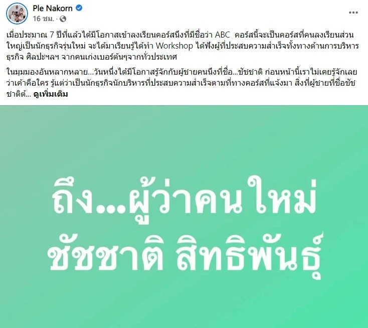 ล่าสุด “เปิ้ล นาคร ศิลาชัย” ได้ออกมาโพสต์ข้อความแสดงความยินดีพร้อมเขียนแคปชั่นบรรยายว่า“เมื่อ 7 ปีที่แล้วที่เรามีโอกาสได้เข้าเรียนและรับฟังพี่อยู่นะครับ แล้วพี่ก็เป็นตัวอย่าง เป็นต้นแบบของการเป็นผู้นำครอบครัวให้กับเรา เชื่อว่าสิ่งที่ท่านกำลังจะทำต่อจากนี้ไปน่าจะเป็นเรื่องที่ไม่มีอะไรจะใหญ่ไปกว่าพลังแห่งความรักที่ท่านเล่าให้พวกเราฟังในวันนั้นเรื่องที่พี่พูดในการจัดการกับวิกฤติที่แสนยากลำบากที่พี่ทำให้กับทำให้กับคนที่รักที่สุดมาแล้ว….(อ่านฉบับเต็มเรื่อง leadership กับชัชชาติโดยนาครได้ที่เพจ ple nakorn)