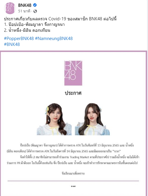 ทำเอาแฟนๆ แสดงความเป็นห่วงกันยกใหญ่ หลังต้นสังกัด BNK48 ออกมาประกาศว่า 2 สมาชิกในวง อย่าง “น้ำหนึ่ง มิลิน ดอกเทียน” และ “ป๊อปเป้อ พิณญาดา จึงกาญจนา” ติดเชื้อโควิด-19 หลังได้ทำการตรวจ ATK และผลออกมาเป็นบวก จึงทำให้ทั้ง 2 สมาชิกไม่สามารถเข้าร่วมงาน Trading Market ตามที่ประกาศไป รวมถึงน้ำหนึ่ง จะไม่ได้เข้าร่วม PR ผ้าผีบอกในวันนี้ด้วยเช่นกัน ซึ่งป๊อปเป้อและน้ำหนึ่ง จะเข้าทำการรักษาตามมาตรการในขั้นตอนต่อไป
