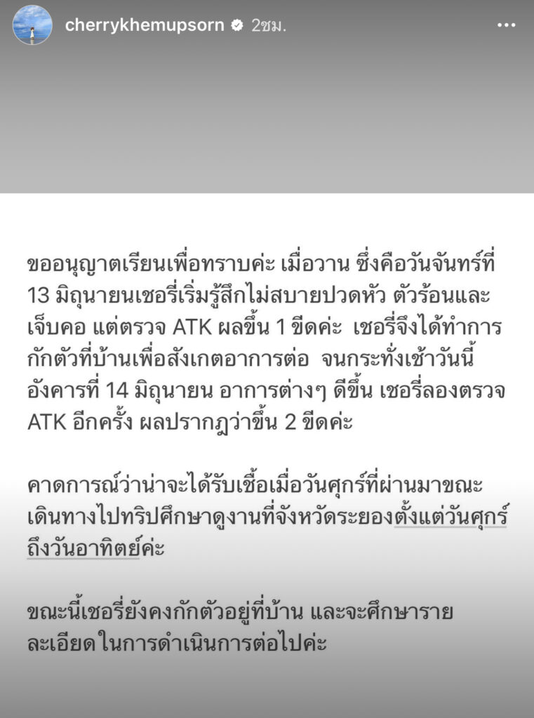 “ขออญุญาติเรียนเพื่อทราบค่ะ เมื่อวาน ซึ่งคือวันจันทร์ที่13 มิถุนายน เชอรี่เริ่มรู้สึกไม่สบายปวดหัว ตัวร้อนและเจ็บคอแต่ตรวจ ATK ขึ้น 1 ขีด จึงได้ทำการกักตัวและสังเกตอาการต่อ กระทั่งวันอังคาร ที่14 มิถุนายน อาการต่างๆ ดีขึ้น จึงลองตรวจ ATK ผลปรากฏว่าขึ้น 2 ขีด คาดการณ์ว่า น่าจะได้รับเชื้อเมื่อวันศุกร์ที่ผ่านมา ขณะเดินทางไปทริปศึกษาดูงาน ที่จังหวัดระยอง ตั้งแต่วันศุกร์ถึงวันอาทิตย์ค่ะ ขณะนี้เชอรี่ยังคงกักตัวอยู่ที่บ้านและจะศึกษารายละเอียดในการดำเนินการต่อไปค่ะ“