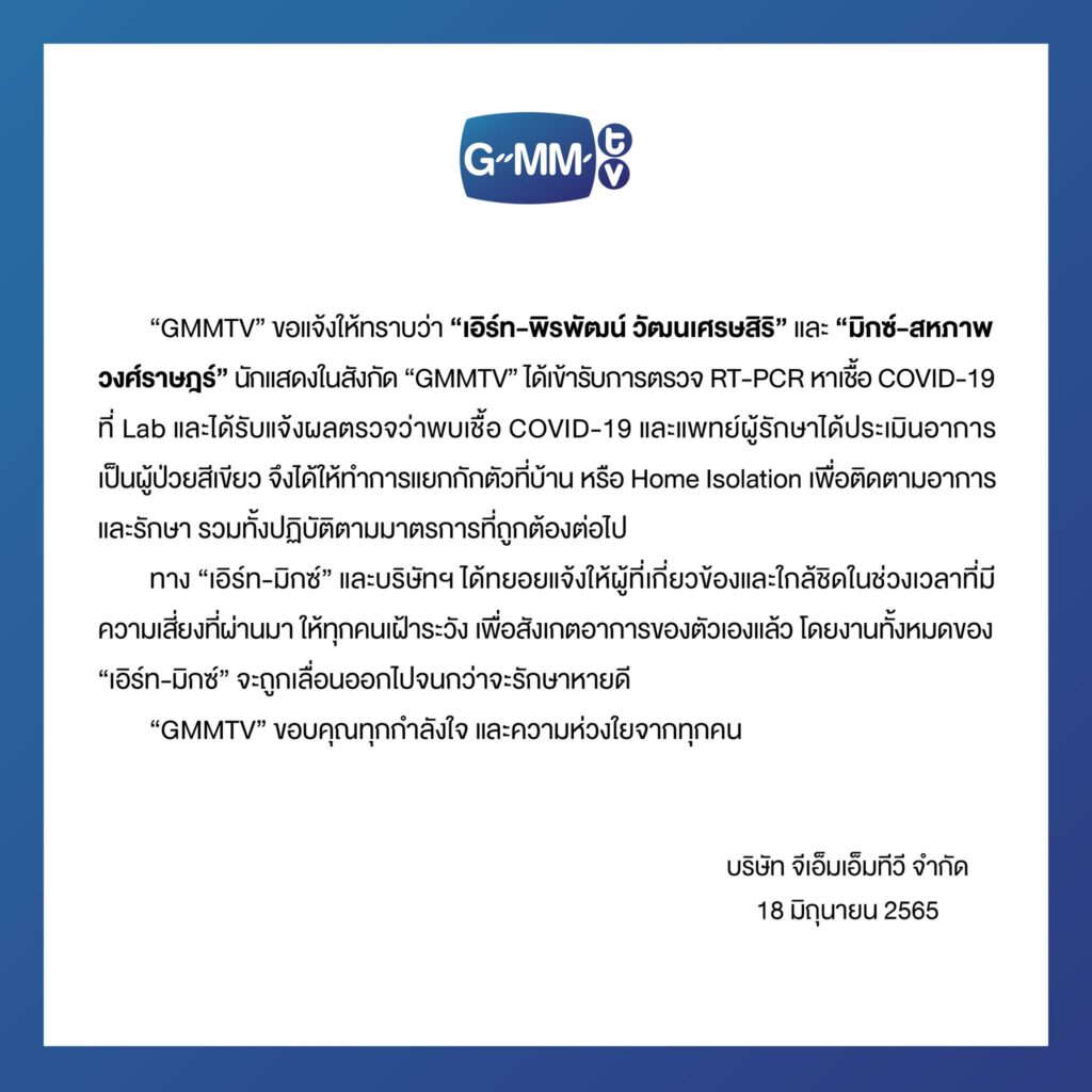 “GMMTV” ขอแจ้งให้ทราบว่า “เอิร์ท-พิรพัฒน์ วัฒนเศรษศิริ” และ “มิกซ์-สหภาพ วงศ์ราษฎร์” นักแสดงในสังกัด “GMMTV” ได้เข้ารับการตรวจ RT-PCR หาเชื่อ COVID-19 ที่ Lad และได้รับแจ้งผลตรวจว่าพบเชื่อ COVID-19 และแพทย์ผู้รักษาได้ประเมินอาการเป็นผู้ป่วยสีเขียว จึงได้ให้ทำการแยกกักตัวที่บ้าน หรือ Home Isolation เพือติดตามอาการและรักษา รวมทั้งปฏิบัติตามมาตรการที่ถูกต้องต่อไป