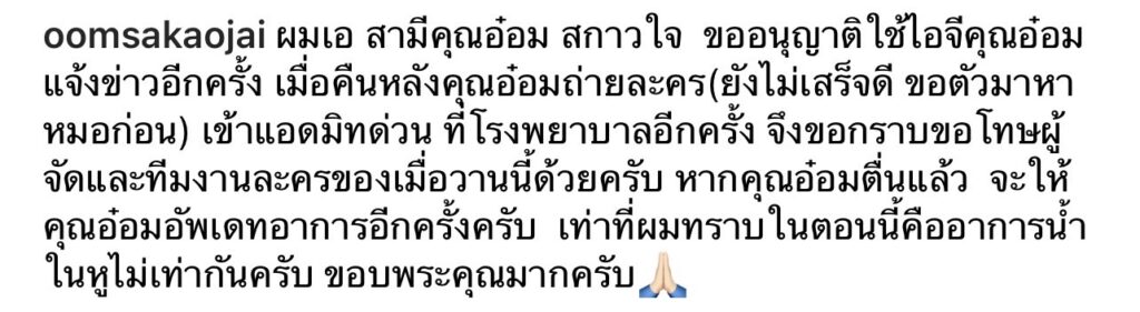 จึงขอกราบขอโทษผู้จัดและทีมงานละครของเมื่อวานนี้ด้วยครับ หากคุณอ๋อมตื่นแล้ว จะให้คุณอ๋อมอัพเดตอาการอีกครั้งครับ เท่าที่ผมทราบในตอนนี้คืออาการน้ำในหูไม่เท่ากันครับ ขอบพระคุณมากครับ”ซึ่งงานนี้ก็มีเพื่อนในวงการบันเทิงและแฟนคลับก็ไม่รอช้ารีบเข้ามาส่งกำลังใจให้สาวอ๋อมกันอย่างล้นลาม
