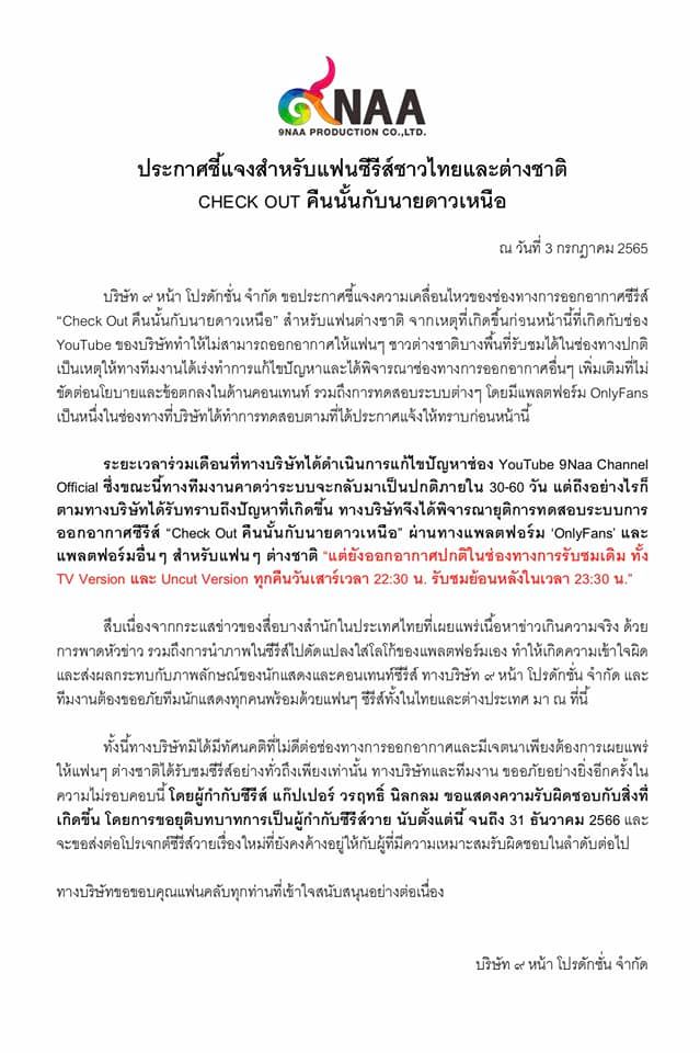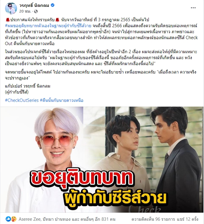 โดยมีข้อความว่า “ประกาศแจ้งให้ทราบครับ นับจากวันอาทิตย์ ที่ 3 กรกฎาคม 2565 เป็นต้นไป #ผมขอยุติบทบาทตัวเองในฐานะผู้กำกับซีรีส์วาย จนถึงสิ้นปี 2566 เพื่อแสดงถึงความรับผิดชอบต่อเหตุการณ์ที่เกิดขึ้น (ไปหาข่าวอ่านกันเองนะครับผมไม่อยากพูดซ้ำอีก) จนนำไปสู่การเผยแพร่เนื้อหาข่าว ภาพข่าวและหัวข้อข่าวที่เกินความจริงจากสื่อมวลชนบางสำนัก ทำให้ส่งผลกระทบต่อภาพลักษณ์ของนักแสดงซีรีส์ Check Out คืนนั้นกับนายดาวเหนือ