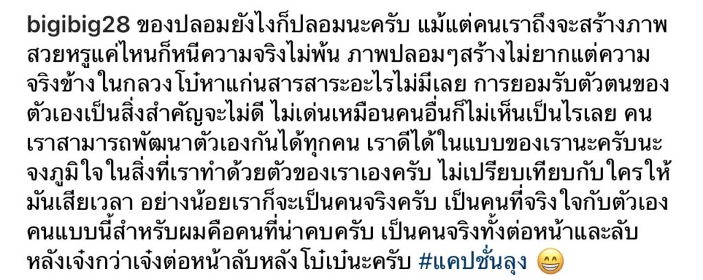 จงภูมิใจในสิ่งที่เราทำด้วยตัวของเราเองครับ ไม่เปรียบเทียบกับใครให้มันเสียเวลา อย่างน้อยเราก็จะเป็นคนจริงครับ เป็นคนที่จริงใจกับตัวเอง คนแบบนี้สำหรับผมคือคนที่น่าคบครับ เป็นคนจริงทั้งต่อหน้าและลับหลังเจ๋งกว่าเจ๋งต่อหน้าลับหลังโบ๋เบ๋นะครับ #แคปชั่นลุง” แหมๆ เรียกว่าแรงสุดในซอยเลยทีเดียว ว่าแต่หนุ่มบิ๊ก จะหมายถึงใครหรือว่าเป็นการโพสต์ลอยๆก็ต้องรอเจ้าตัวออกมาเฉลยเองแล้วกันนะจ๊ะ