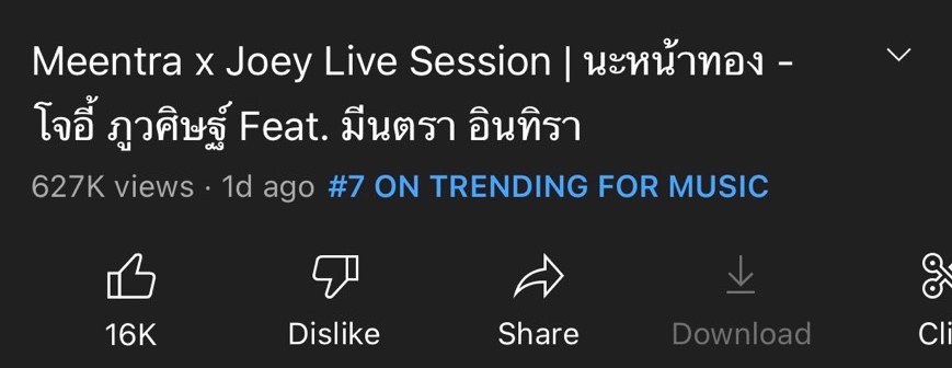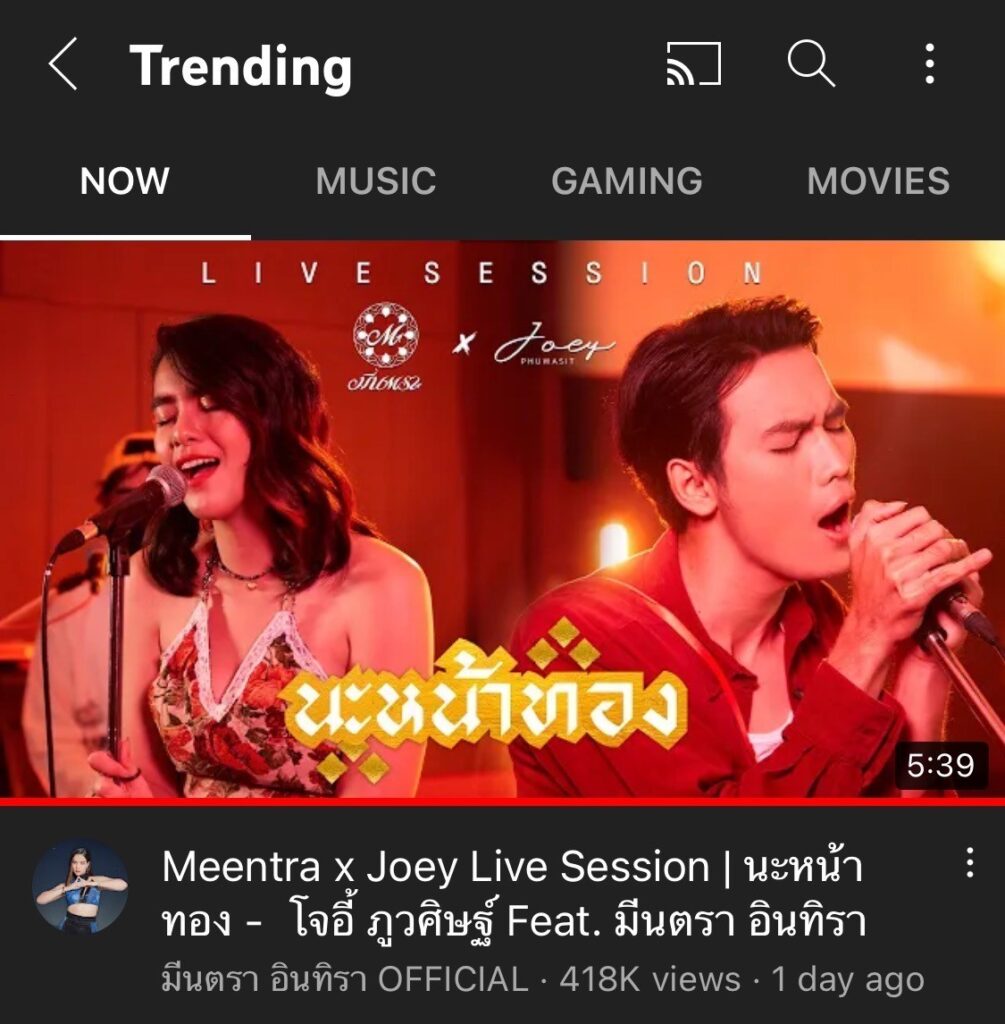 มาแรงจริงๆกับสาว “มีนตรา อินทิรา” และหนุ่ม “โจอี้ ภูวศิษฐ์” ที่หลังจากได้ปล่อย Live Session เพลง นะหน้าทอง ในเวอร์ชันพิเศษ ที่สาวมีนตราขอเรียกแซวเล่นๆว่าเป็นเวอร์ชันคนเท่ และคงต้องยอมรับว่าเท่จริงๆ เพราะล่าสุดเพลงนี้สามารถไต่ขึ้นสู่อันดับ 1 ในมาแรงใน Youtube เป็นที่เรียบร้อยแล้ว ในเวลาเพียงแค่ 1 วัน แถมตอนนี้ยอดวิวก็ยังคงพุ่งทะยานขึ้นเรื่อยๆ จนตอนนี้ติด #7เพลงในมาแรงแล้วด้วยเช่นกัน จนแฟนๆต่างพูดเป็นเสียงเดียวกันว่าเหมือนได้ปลดล็อกสกิลหูทองคำ