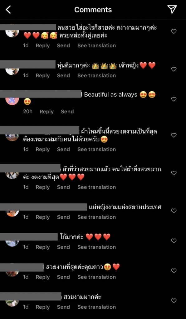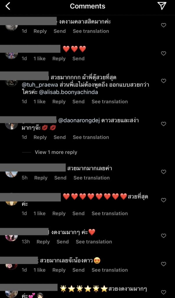 ซึ่งหลังจากที่ภาพดังกล่าวได้ถูกโพสต์ออกไป แฟนคลับและชาวเน็ตที่ติดตาม IG : Daonarongdej ได้เข้ามาชื่นชมถึงความงดงามในการแต่งกายด้วยผ้าไทยกันอย่างมากมาย อาทิ งดงามคลาสสิคมากค่ะ , โก้มากค่ะ , ผ้าสวย คนออกแบบตัดฝีมือดี คนใส่สวยที่สุด รวมคือสุดยอดค่ะ , ผู้หญิงที่แต่งตัวได้สวยที่สุดแห่งปี , งดงามขอมอบหัวใจให้ล้านดวงค่ะ , คนสวยใส่อะไรก็สวยค่ะ สง่างามมากๆค่ะ สวยหล่อทั้งคู่เลยค่ะ , ผ้าที่ว่าสวยมากแล้ว คนใส่ผ้ายิ่งสวยมากค่ะ งดงามที่สุด , สวยที่สุดเลยค่ะ