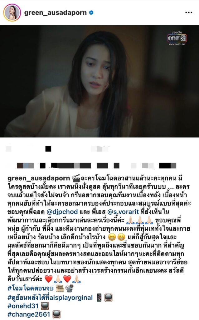 กรีน อัษฎาพร “ 🎬ละคร โฉมโฉด อวสานแล้วนะคะทุกคน มีใครดูสดบ้างมั้ยคะ เราคนนึงนั่งดูสด ลุ้นทุกวินาทีเลยคร้าบบบ … ละครจบแล้วแต่ใจยังไม่จบจ้า กรีนอยากขอบคุณทีมงานเบื้องหลัง เบื้องหน้าทุกคนฮับที่ทำให้ละครออกมาครบองค์ประกอบและสมบูรณ์แบบที่สุดค่ะ ขอบคุณพี่ฉอด @djpchod และ พี่เอส @s.vorarit ที่ยังเห็นในพัฒนาการและเลือกกรีนมาเล่นละครเรื่องนี้ค่ะ 🙏🏻🙏🏻🙏🏻 ขอบคุณพี่หนุ่ย ผู้กำกับ พี่ผึ้ง และทีมงานกองถ่ายทุกคนนะคะที่ทุ่มเททั้งใจและกาย เหนื่อยบ้าง ร้อนบ้าง เลิกดึกบ้างไรบ้าง 😁😁 แต่ก็สู้กันสุดใจและผลลัพธ์ที่ออกมาก็คือดีมากๆ เป็นที่พูดถึงและชื่นชอบกันมาก ที่สำคัญที่สุดเลยคือคุณผู้ชมละครทางสดและออนไลน์มากๆนะคะที่ติดตามทุกสัปดาห์และชอบในบทบาทของนักแสดงทุกคน สุดท้ายหมออาจารีย์ขอให้ทุกคนปล่อยวางและอย่าสร้างเวรสร้างกรรมกันอีกเลยนะคะ สวัสดีคืนวันเสาร์ค่ะ ❤️🙏🏻❤️🙏🏻 #โฉมโฉดตอนจบ #ดูย้อนหลังได้ที่aisplayorginal #onehd31 #change2561