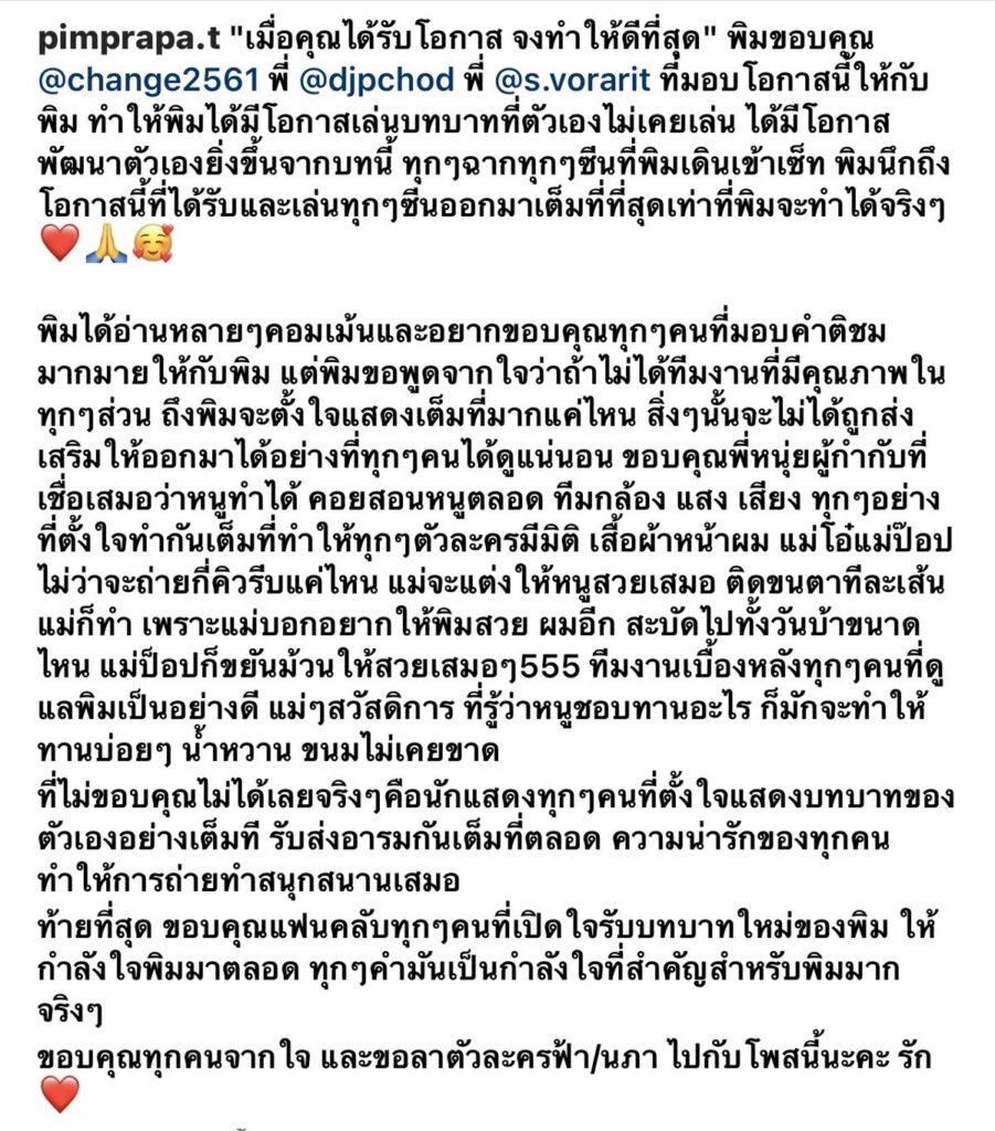 พิม พิมประภา “เมื่อคุณได้รับโอกาส จงทำให้ดีที่สุด” พิมขอบคุณ @change2561 พี่ @djpchod พี่ @s.vorarit ที่มอบโอกาสนี้ให้กับพิม ทำให้พิมได้มีโอกาสเล่นบทบาทที่ตัวเองไม่เคยเล่น ได้มีโอกาสพัฒนาตัวเองยิ่งขึ้นจากบทนี้ ทุกๆฉากทุกๆซีนที่พิมเดินเข้าเซ็ท พิมนึกถึงโอกาสนี้ที่ได้รับและเล่นทุกๆซีนออกมาเต็มที่ที่สุดเท่าที่พิมจะทำได้จริงๆ