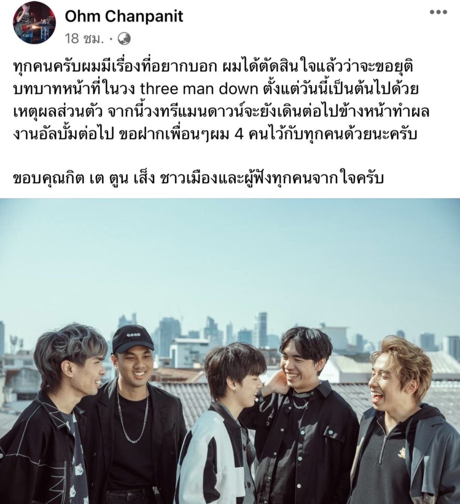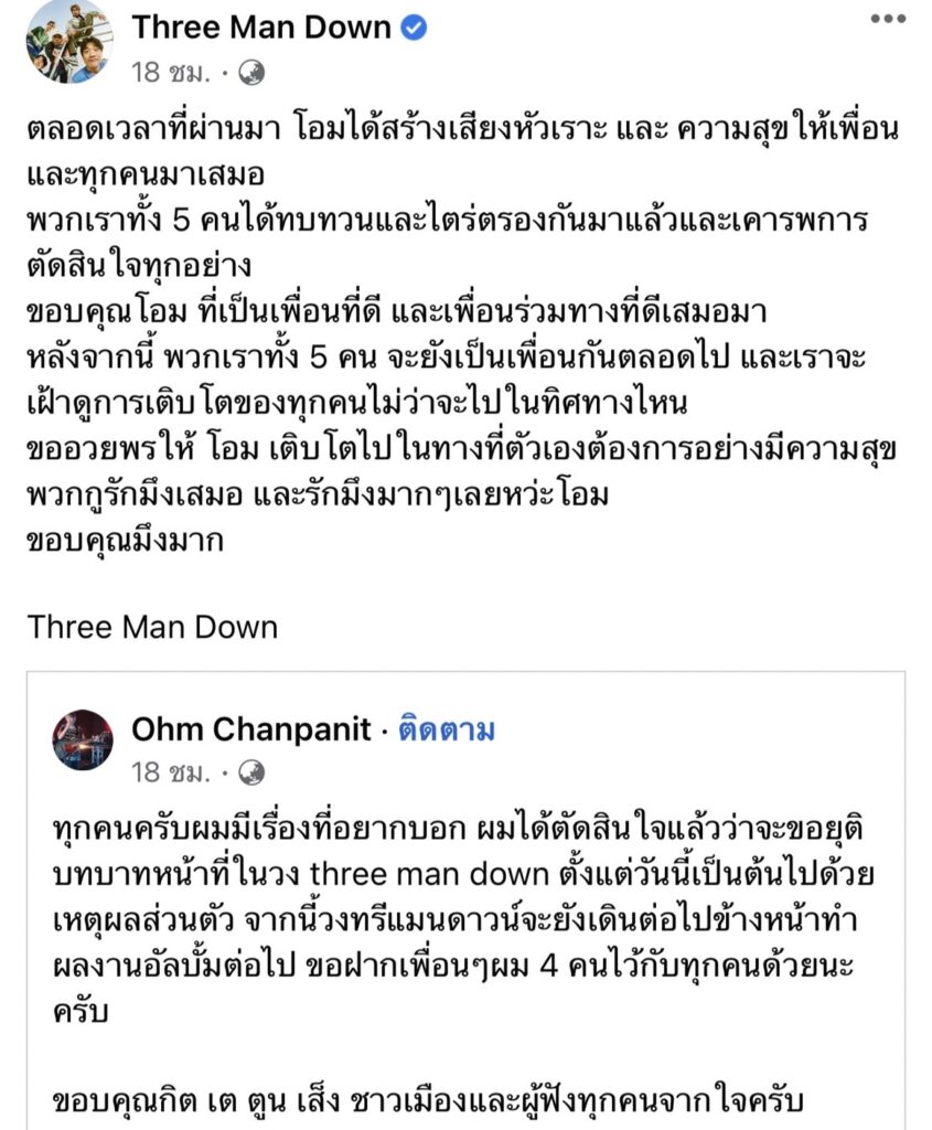 ซึ่งต่อมาทางวงก็ได้แชร์ข้อความของโอมพร้อมเขียนแคปชันว่า “ตลอดเวลาที่ผ่านมา โอมได้สร้างเสียงหัวเราะ และ ความสุขให้เพื่อนและทุกคนมาเสมอพวกเราทั้ง 5 คนได้ทบทวนและไตร่ตรองกันมาแล้วและเคารพการตัดสินใจทุกอย่างขอบคุณโอม ที่เป็นเพื่อนที่ดี และเพื่อนร่วมทางที่ดีเสมอมาหลังจากนี้ พวกเราทั้ง 5 คน จะยังเป็นเพื่อนกันตลอดไป และเราจะเฝ้าดูการเติบโตของทุกคนไม่ว่าจะไปในทิศทางไหนขออวยพรให้ โอม เติบโตไปในทางที่ตัวเองต้องการอย่างมีความสุขพวกกูรักมึงเสมอ และรักมึงมากๆเลยหว่ะโอมขอบคุณมึงมาก Three Man Down”