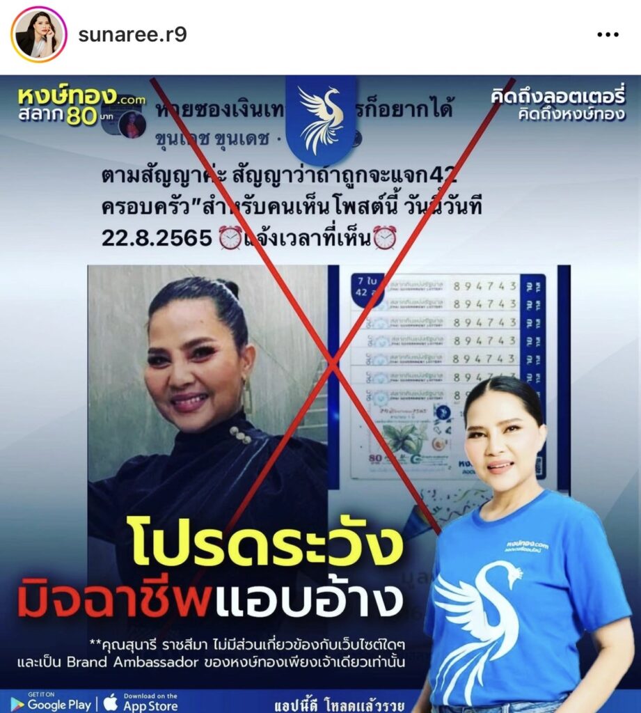 ทำเอาเจ้าแม่ใบ้หวยถึงกับออกอาการเซงกันเลยทีเดียว เมื่อถูกนำรูปไปแอบอ้างในเว็บไซต์การพนัน สำหรับนักร้องเสียงดี”สุนารี ราชสีมา” ที่ล่าสุดเจ้าตัวทนไม่ไหว หวั่นคนเข้าใจผิด รีบออกมาชี้แจ้งผ่านทางไอจีส่วนตัวโดนโพสต์ภาพพร้อมแคปชั่นว่า”พวกแอบอ้างเว็บไซต์การพนัน เพจการพนันต่างๆที่เอารูป สุไปโฆษณาแอบอ้าง สุไม่มีส่วนเกี่ยวข้องแต่อย่างใดเด้อค่ะ สุเป็นพรีเซนเตอร์ของหงษ์ทองลอตเตอรี่ออนไลน์เจ้าเดียวเท่านั้น มีหลายคนตกเป็นเหยื่อ เลยอยากฝากเตือนทุกคนนะคะ”
