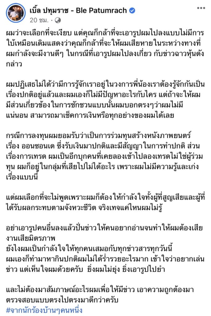 ชี้แจงด่วน! นักร้องหนุ่ม”เบิ้ล ปทุมราช”ยันไม่เกี่ยวข้องคดีแชร์ Forex พร้อมให้ตรวจสอบการเงิน วอนหยุดพาดพิงกระทบภาพลักษณ์