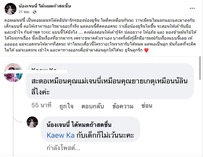 ล่าสุด “เจนนี่ รัชนก” ได้โพสต์คอมเมนต์ดังกล่าวลงเฟซบุ๊กส่วนตัว พร้อมร่ายยาวระบายความรู้สึกว่า… “คอมเมนต์นี้ เป็นคอมเมนต์ใต้คลิปน่ารักๆ ของน้องยูจิน ไม่คิดเหมือนกันนะ ว่าจะมีคนไม่แยกแยะและมาลงกับเด็กแบบนี้ ต่อให้เราผ่านอะไรมาเยอะก็จริง แต่ตอนนี้คิดตลอดนะ ว่าเมื่อน้องยูจินโตขึ้น จะสอนให้เค้ารับมือและเข้าใจ กับคำพูด toxic แบบนี้ได้ยังไง …. คงต้องสอนให้เค้ารู้จัก ปล่อยวาง ให้อภัย และมองข้ามมันไปให้ได้ในทุกๆ เรื่อง ซึ่งเป็นเรื่องที่ยากมากๆ เพราะขนาดตัวเราเอง บางครั้งยังรู้สึกมีอารมณ์กับเรื่องแบบนี้เลย เห้อออออ แม่จะอดทนให้มากที่สุดนะ ทำไมนะเดี๋ยวนี้ใครว่าอะไรเราเรารับได้หมด แต่พอเป็นลูกมันก็อดที่จะคิดไม่ได้ แม่จะอดทน เข้าใจ และหาทางออกเพื่อนำมาสอนลูกให้ได้นะ ยูจินลูกรัก”