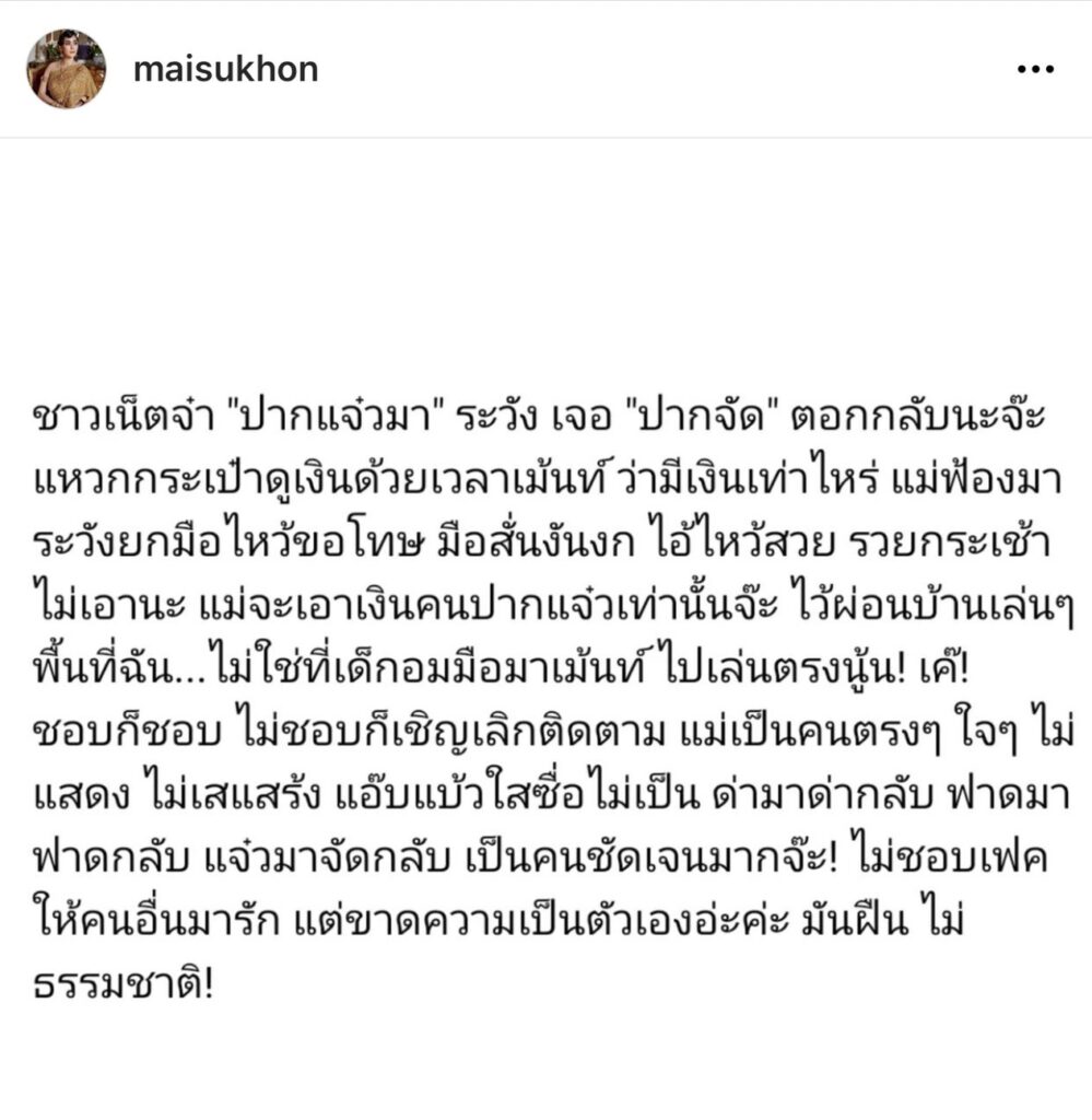 “พื้นที่ฉัน…ไม่ใช่ที่เด็กอมมือมาคอมเมนต์ ไปเล่นตรงนู้น! เค๊! ชอบก็ชอบ ไม่ชอบก็เชิญเลิกติดตาม แม่เป็นคนตรงๆ ใจๆ ไม่แสดง ไม่เสแสร้ง แอ๊บแบ๊วใสซื่อไม่เป็น ด่ามาด่ากลับ ฟาดมาฟาดกลับ แจ๋วมาจัดกลับ เป็นคนชัดเจนมากจ๊ะ! ไม่ชอบเฟคให้คนอื่นมารัก แต่ขาดความเป็นตัวเองอะค่ะ มันฝืน ไม่ธรรมชาติ!”