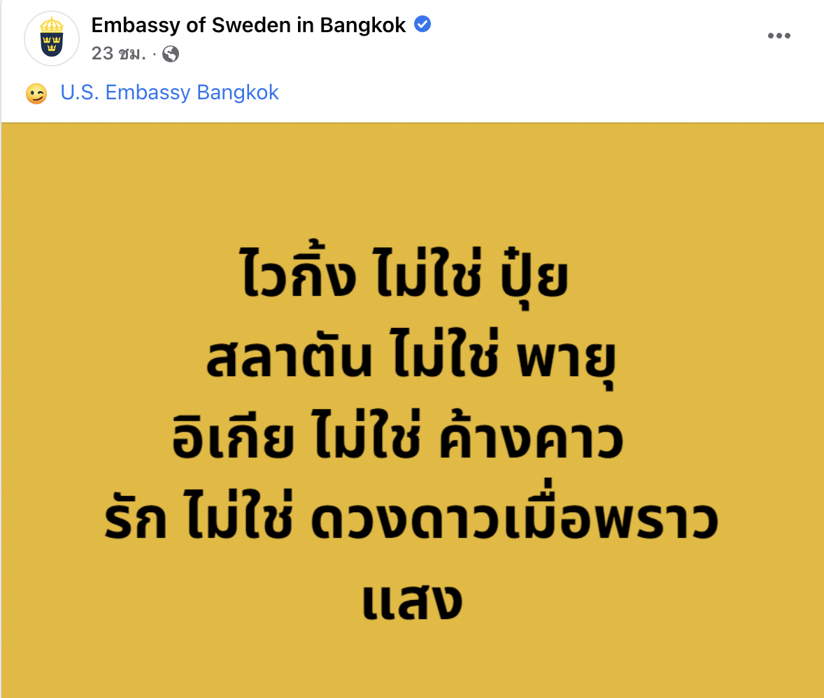เช่นเดียวกับแบรนด์สินค้าต่างๆที่ จับกระแส รักไม่ใช่ดวงดาวเมื่อพราวแสง ได้ทัน ปรับนิดเติมหน่อยให้เข้ากับสินค้าตัวเองให้ขายได้แบบเนียนๆ และพีคยิ่งกว่าเก่า เมื่อ เพจเฟซบุ๊กของสถานเอกอัครราชทูตสหรัฐและสถานกงสุลในประเทศไทย ได้ออกมาเล่นวลียอดฮิตนี้เหมือนกัน