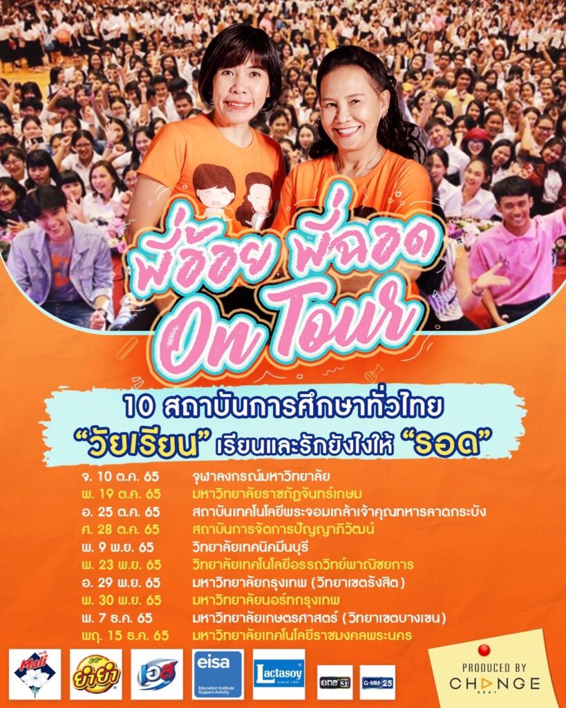 กลับมาอีกครั้งแล้วกับกิจกรรม “พี่อ้อย พี่ฉอด ON TOUR” ที่น้องๆ จากทุกสถาบันการศึกษาเรียกร้องให้ “พี่อ้อย-นภาพร ไตรวิทย์วารีกุล และ พี่ฉอด-สายทิพย์ มนตรีกุล ณ อยุธยา CEO บริษัท CHANGE2561 มาช่วยให้คำปรึกษาปัญหาหัวใจ ปรับเปลี่ยนมุมมองความรัก พัฒนาความสัมพันธ์ เพราะน้องๆวัยเรียนยุคนี้ เรียน..ก็หนัก!! รัก..ก็เศร้า พี่ๆจะไปหา ไปคุยกับน้องๆ วัยเรียนถึงที่กับ 10 สถาบันการศึกษาทั่วประเทศไทย ตลอดทั้งเทอมนี้ ได้แก่ จุฬาลงกรณ์มหาวิทยาลัย , มหาวิทยาลัยราชภัฏจันทร์เกษม ,สถาบันเทคโนโลยีพระจอมเกล้าเจ้าคุณทหารลาดกระบัง , สถาบันการจัดการปัญญาภิวัฒน์ , วิทยาลัยเทคนิคมีนบุรี , วิทยาลัยเทคโนโลยีอรรถวิทย์พาณิชยการ, มหาวิทยาลัยกรุงเทพ (วิทยาเขตรังสิต) , มหาวิทยาลัยนอร์ทกรุงเทพ , มหาวิทยาลัยเกษตรศาสตร์ (วิทยาเขตบางเขน) , มหาวิทยาลัยเทคโนโลยีราชมงคลพระนคร