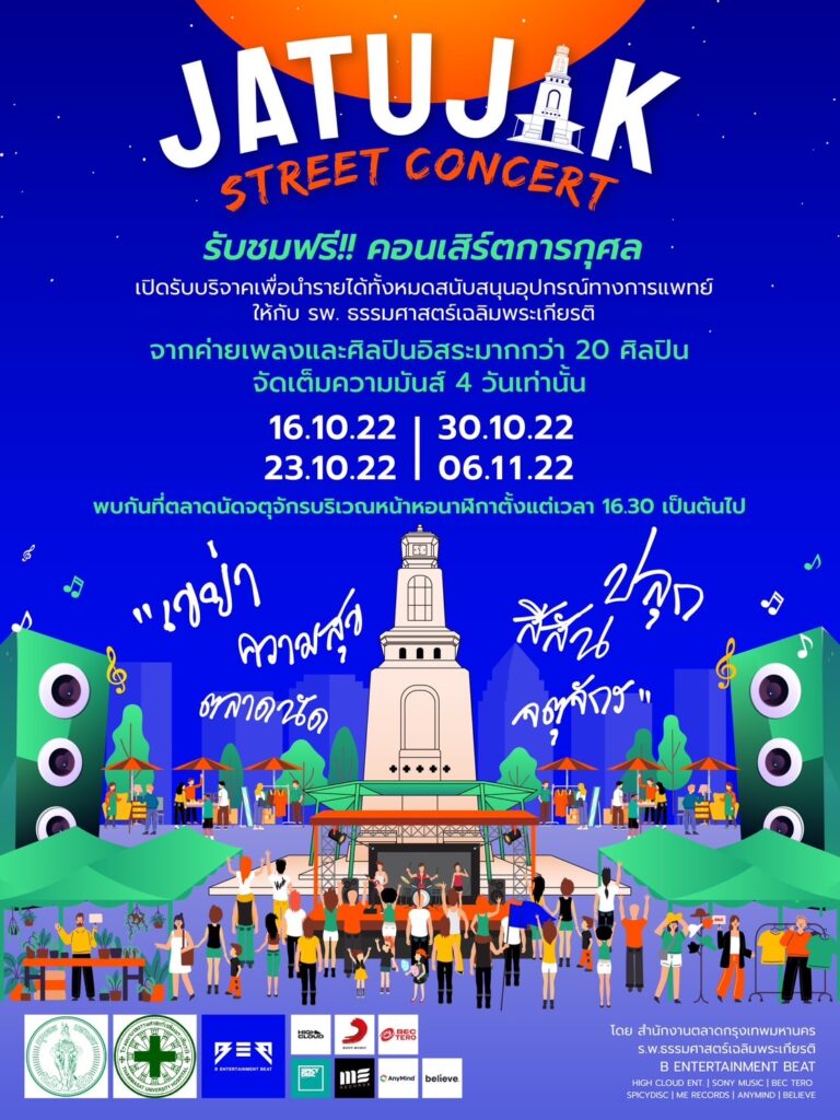 สำหรับกิจกรรม “JATUJAK STREET CONCERT” พร้อมจัดเต็มความมันส์ 4 วัน ในวันอาทิตย์ที่ 16 , 23 , 30 ตุลาคม 2565 และ 6 พฤศจิกายน2565 โดยมีศิลปินมากมายจากหลากหลายค่ายสลับกันมาร่วมสร้างความสุขผ่านเสียงเพลง ให้ทุกคนได้ฟังและชมกัน ประเดิมอาทิตย์แรกวันที่ 16 ตุลาคม 2565 แฟน ๆ จะได้พบกับพิธีเปิดงานอย่างเป็นทางการ ซึ่งได้รับเกียรติจากคุณชัชชาติ สิทธิพันธุ์ ผู้ว่าราชการกรุงเทพมหานคร, คุณอภิสิทธิ์ ไล่ศัตรูไกล ประธานคณะกรรมการบริหารสำนักงานตลาดกรุงเทพมหานคร พร้อมกิจกรรมความสนุกและรับชมฟรีคอนเสิร์ตการกุศลสุดพิเศษจาก P-HOT, NESYUD, LLB, MARIKO, TOFFEE, T!NE แฟน ๆ เตรียมปักหมุดแล้วไปเจอกันได้ตั้งแต่เวลา 16.00 น. เป็นต้นไป ที่ตลาดนัดจตุจักร บริเวณหน้าหอนาฬิกา