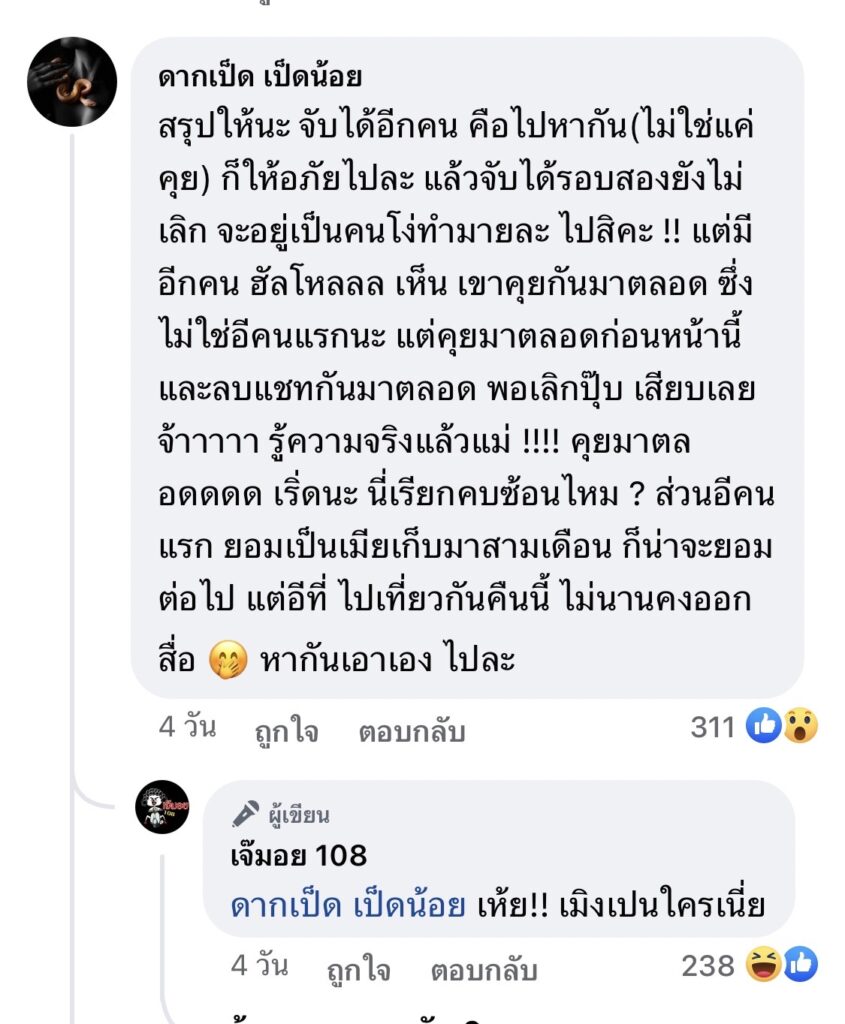 ซึ่งสาเหตุของการจบความสัมพันธ์เป็นเรื่องที่จับได้ฝ่ายชายคุยกับสาวอื่น มีการลบแชท 2 ครั้ง นอกจากนี้ยังมีคนแคปรูปต่างๆของฝ่ายชายกับสาวอื่นมาให้ด้วย