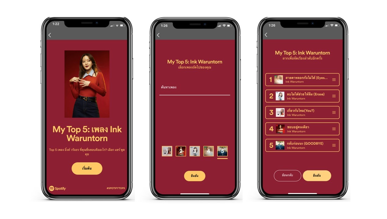 Spotify เปิดตัวฟีเจอร์ “My Top 5: Ink Waruntorn” ลูกเล่นใหม่ในแอป Spotify เอาใจแฟนเพลง อิ้งค์ วรันธร